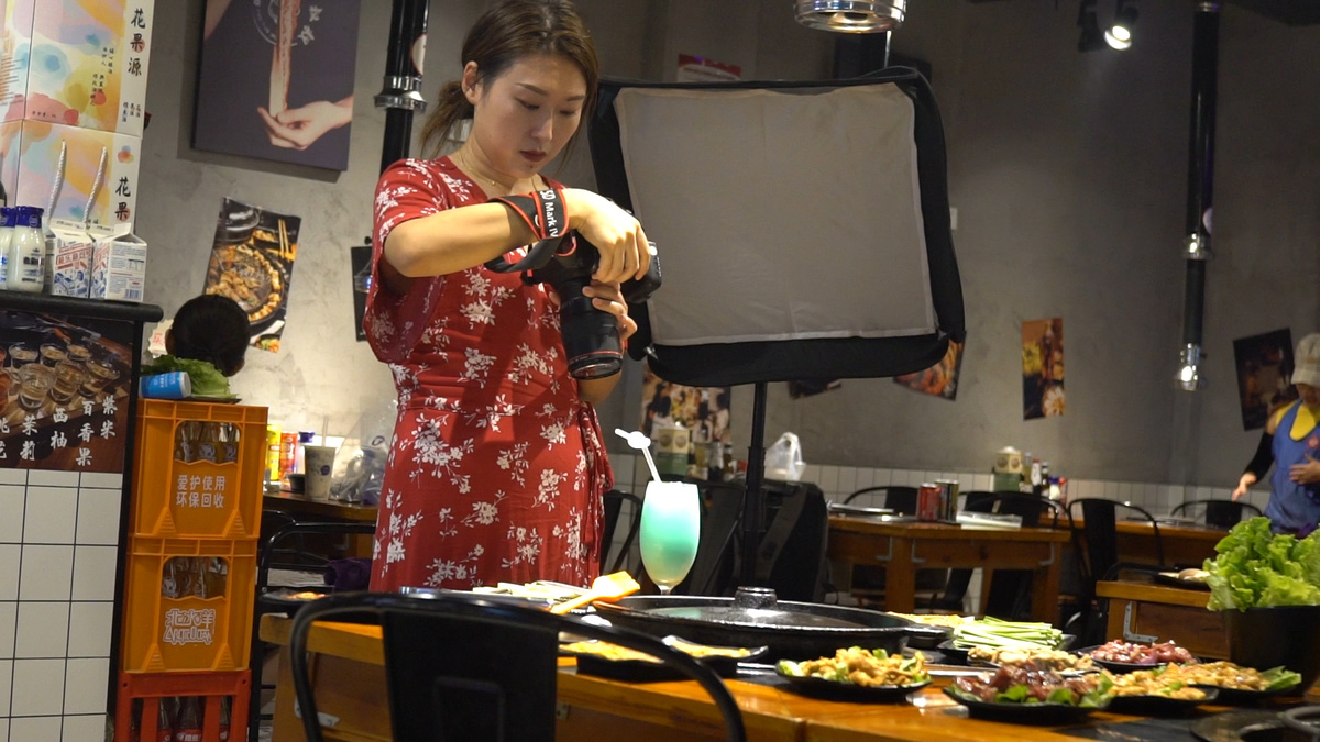 9月10日,与八两在一家烤肉店碰面,她正忙着场景选择、灯光布置、桌面布景,一直到摆盘、测光、布烟......打完招呼后,她就完全沉浸其中,基本忽略了我们的存在。几个小时里,作为旁观者的我,一边享受烤肉在烤网上滋滋作响的视觉和弥漫整个房间的嗅觉诱惑,一边饥肠辘辘的观赏她有条不紊的工作。