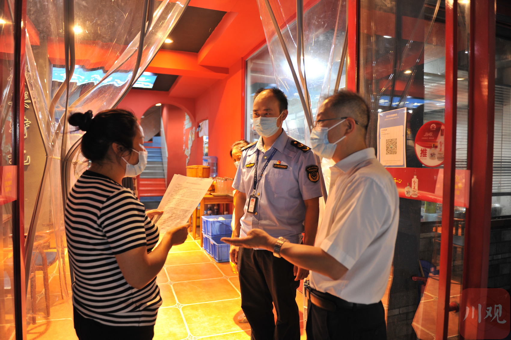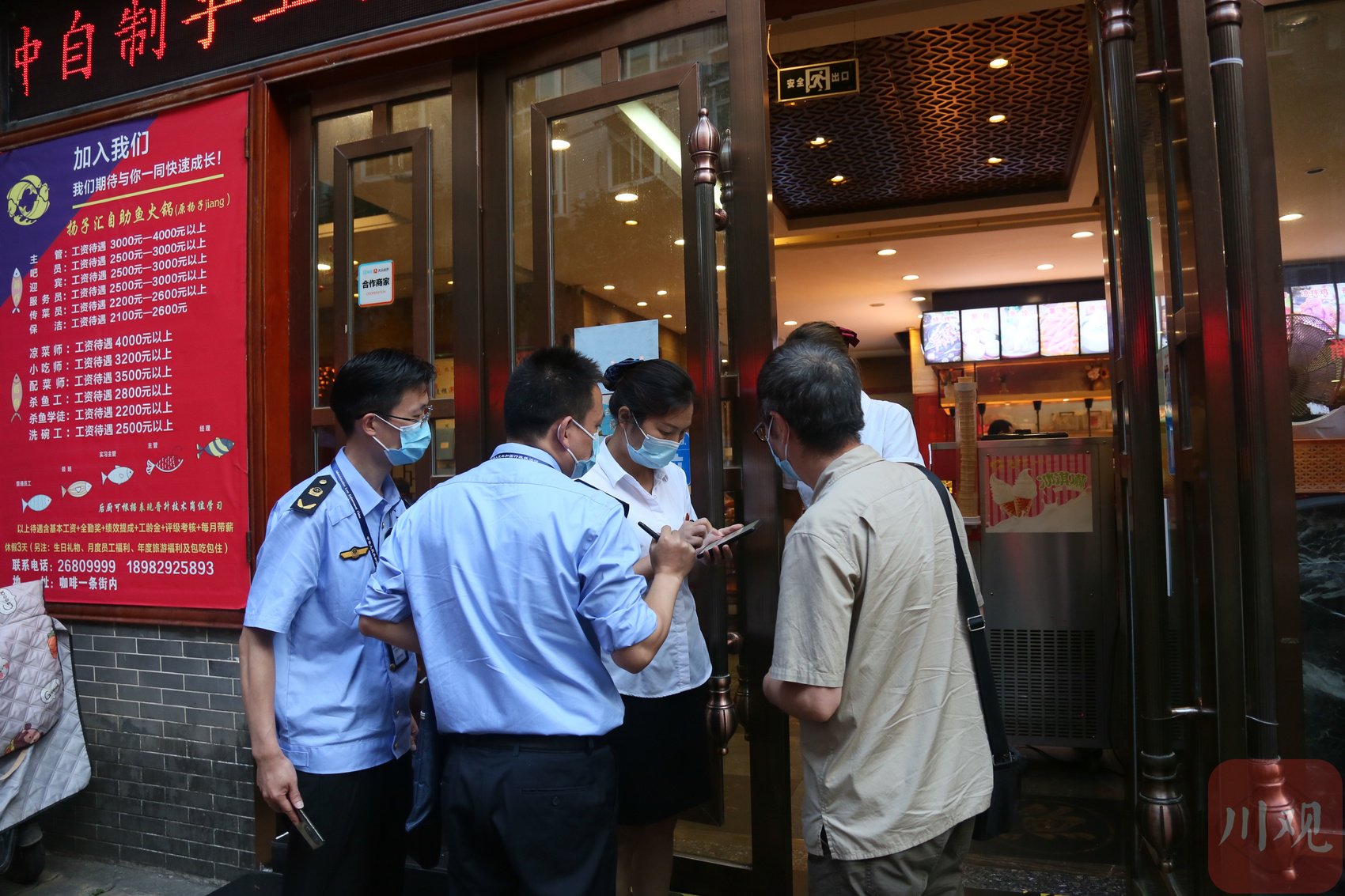 现场检查各餐饮单位“四必查”(扫场所码必查、风险城市旅居史必查、48小时内核酸阴性证明必查、戴口罩必查)执行、落实专人负责疫情防控、店内就餐秩序等情况,抽验店内场所码扫码人次、人员核酸检测报告等情况,抽问疫情防控专员发现健康码“红黄码”时应急处置流程知晓情况。对检查发现的部分店员未规范佩戴口罩等问题督促其立即整改,发现的一家声称“几个朋友一起打几局”的棋牌室(麻将馆),责令其立即关停。