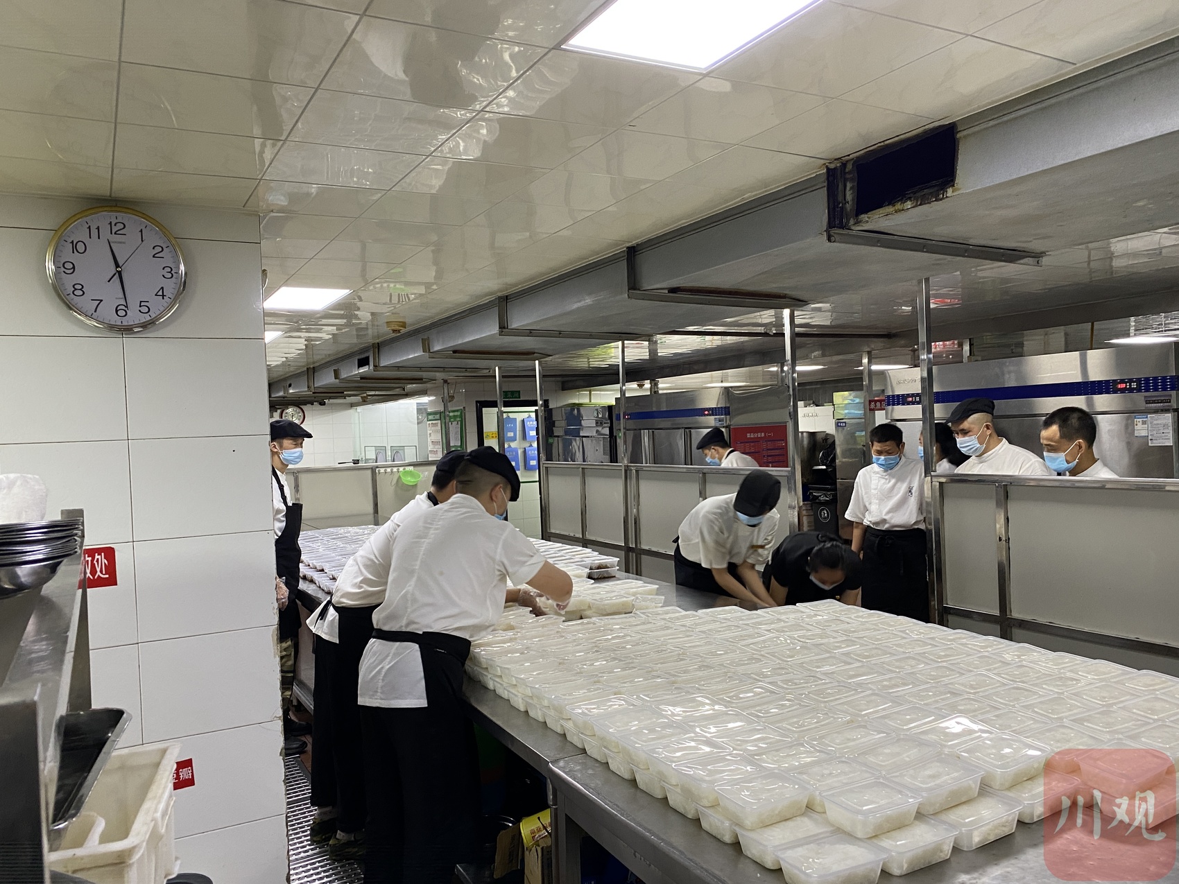 “还有3分钟11点,准备装饭!”桌子这头,现场员工再次认真擦拭,有人准备一次性饭盒,有人把新鲜出炉的腌菜炒肉端上桌,有人拉来运输箱。记者注意到,为了让盒饭肉菜均匀,宋艳华和同事一边打包,一边用勺子不停在盛菜的盆里翻动,他告诉记者,每份盒饭,菜量保证在5两左右,“一线抗疫辛苦,这样大家才能吃得饱、吃得好。”