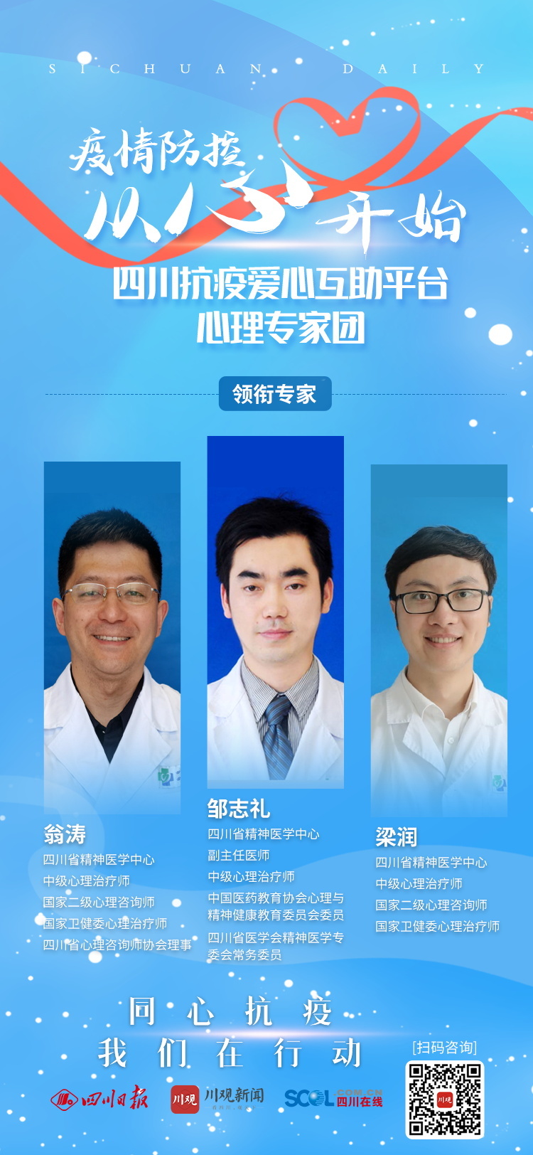 如果有这些困惑,不要着急,点击上图海报,进入四川抗疫爱心互助平台,我们会有权威的心理专家为你一对一支招。
