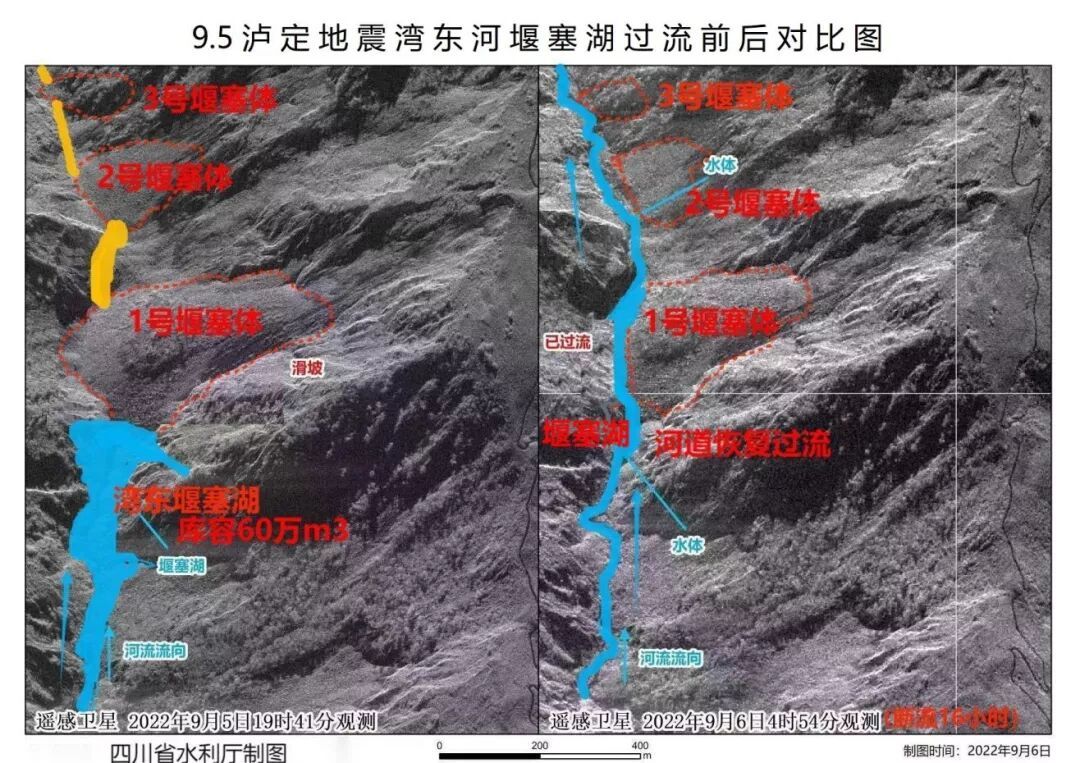 据了解,受泸定“9·5”地震影响,大渡河右岸一级支流湾东河沿岸山体发生滑坡,导致其干流上出现3处较大滑坡堰塞体,其中最大的一处形成了堰塞湖。据现场工作组监测,该堰塞湖已于9月6日恢复了过流。