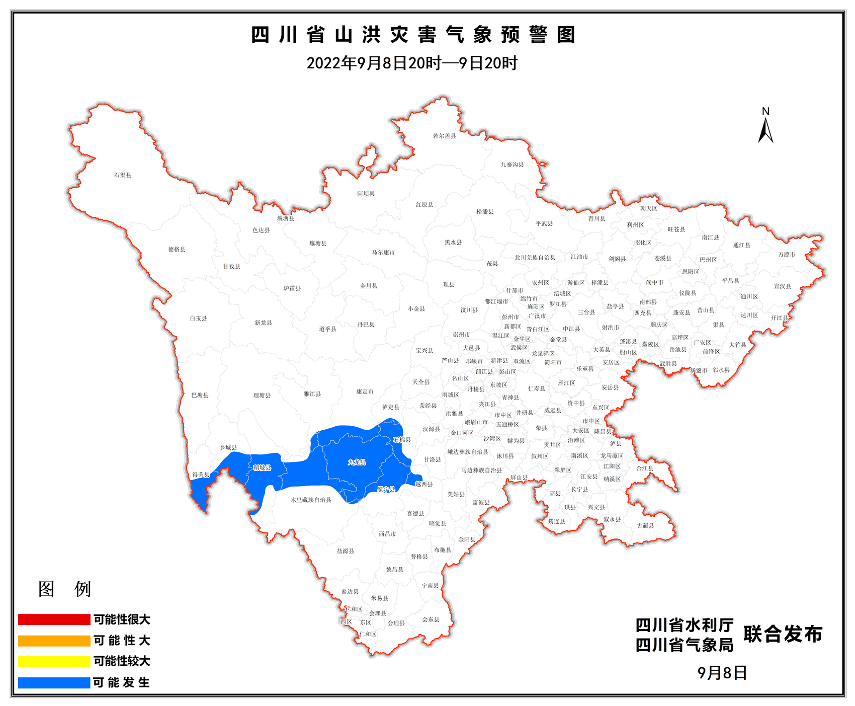 预警信息显示:9月8日20时至9日20时,甘孜州康定市、泸定县、得荣县、乡城县、稻城县、雅江县、九龙县,凉山州木里县、冕宁县、越西县,雅安市石棉县等11个县(市)可能发生山洪灾害。