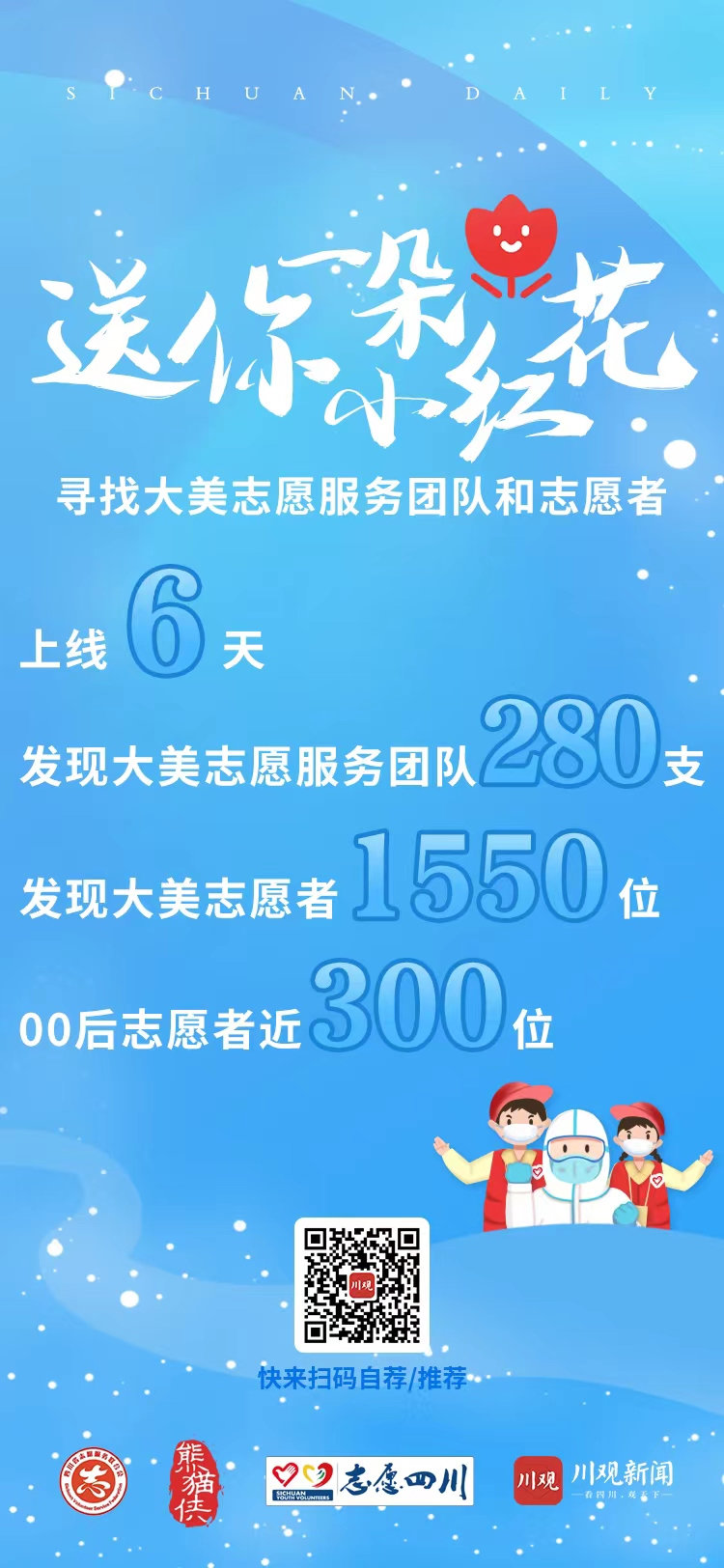 由川观新闻发起的“送你一朵小红花——寻找大美志愿服务团队和志愿者”活动上线6天,受到广泛关注,发现近2000个来自社会各领域的优秀志愿服务团队和志愿者。