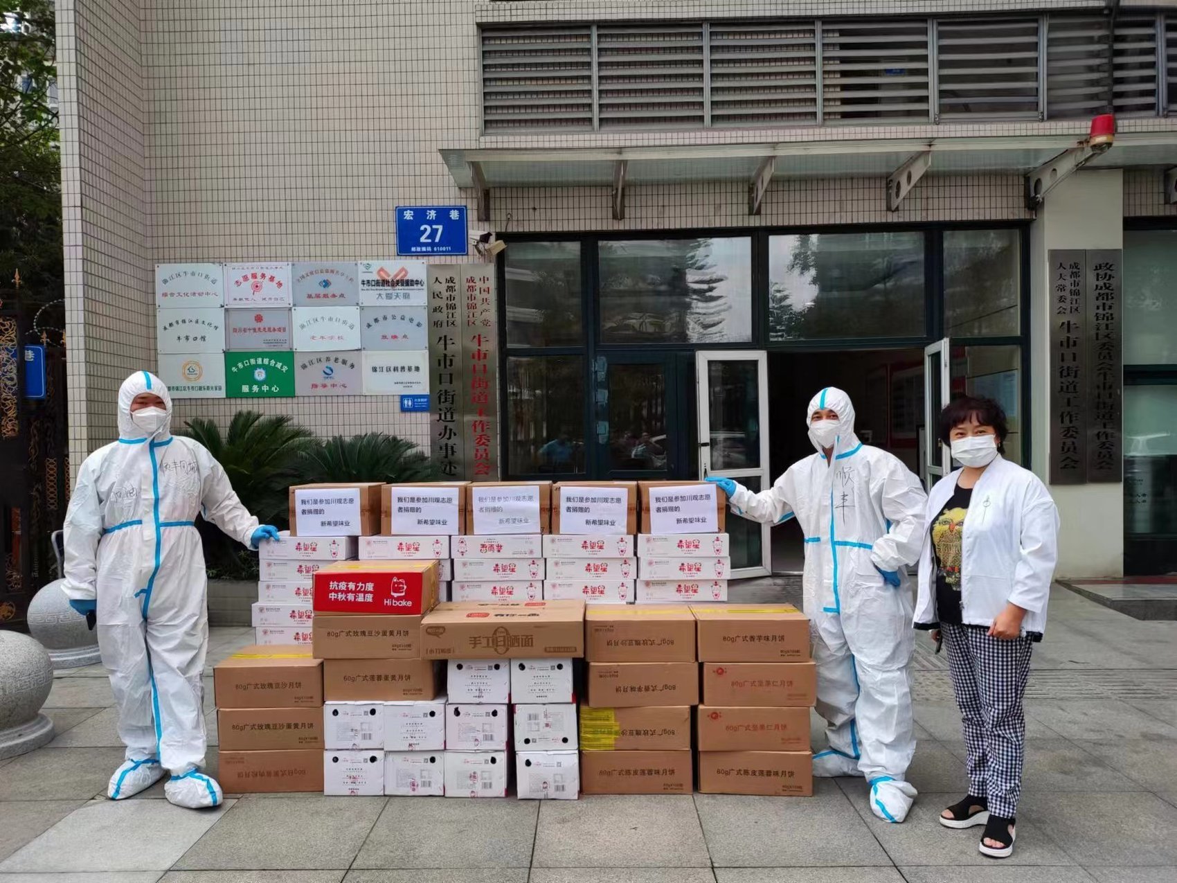 被大美抗疫志愿服务团队和志愿者的故事所感动,成都多家爱心企业积极主动地参与了川观新闻组织的慰问大美抗疫志愿服务团队和志愿者的活动,其中四川新希望华西乳业捐赠了500箱常温酸奶、新希望味业捐赠了鱼香双椒酱、无骨鸡辣酱、精品白菜腐乳等共计1450盒、四川有你一面食品有限公司捐赠了120份紫薯面量贩装、成都五里关餐饮管理有限公司捐赠了矿泉水2400瓶、四川金拱门食品有限公司捐赠了200套麦当劳餐食。