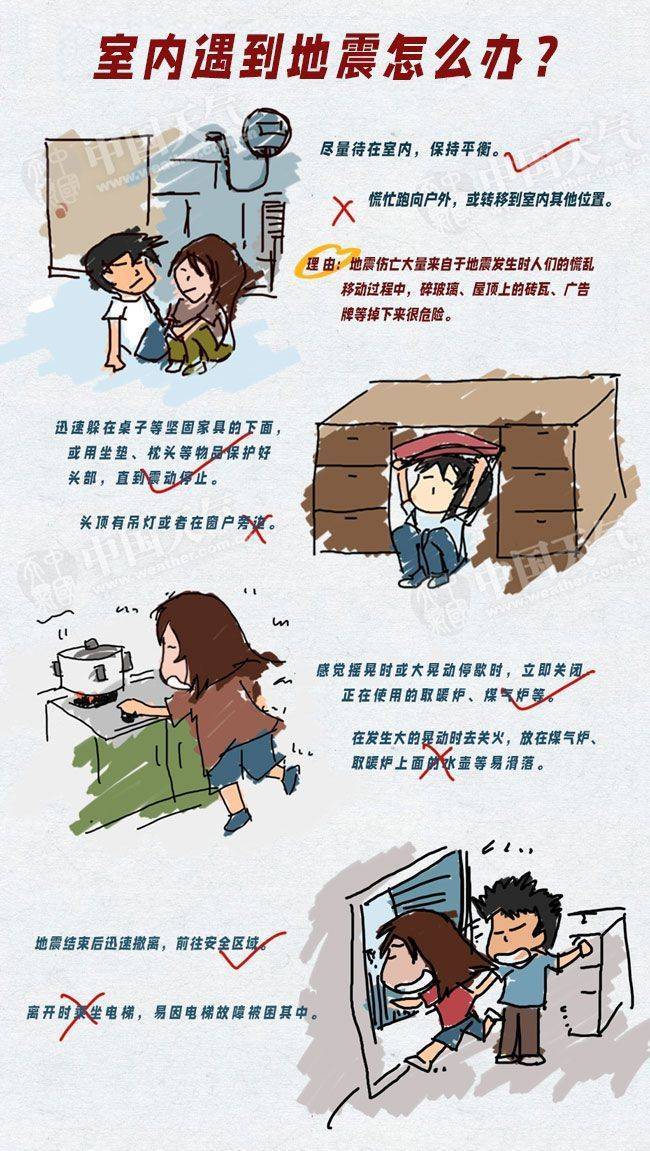 在室内遇到地震时,应尽量待在室内,保持平衡,不要慌忙跑向户外,或转移到室内其他位置。迅速躲在桌子等坚固家具的下面,或用坐垫、枕头等物品保护好头部,直到震动停止。感觉摇晃时或大晃动停歇时,立即关闭正在使用的取暖炉、煤气炉等。地震结束后迅速撤离,前往安全区域。