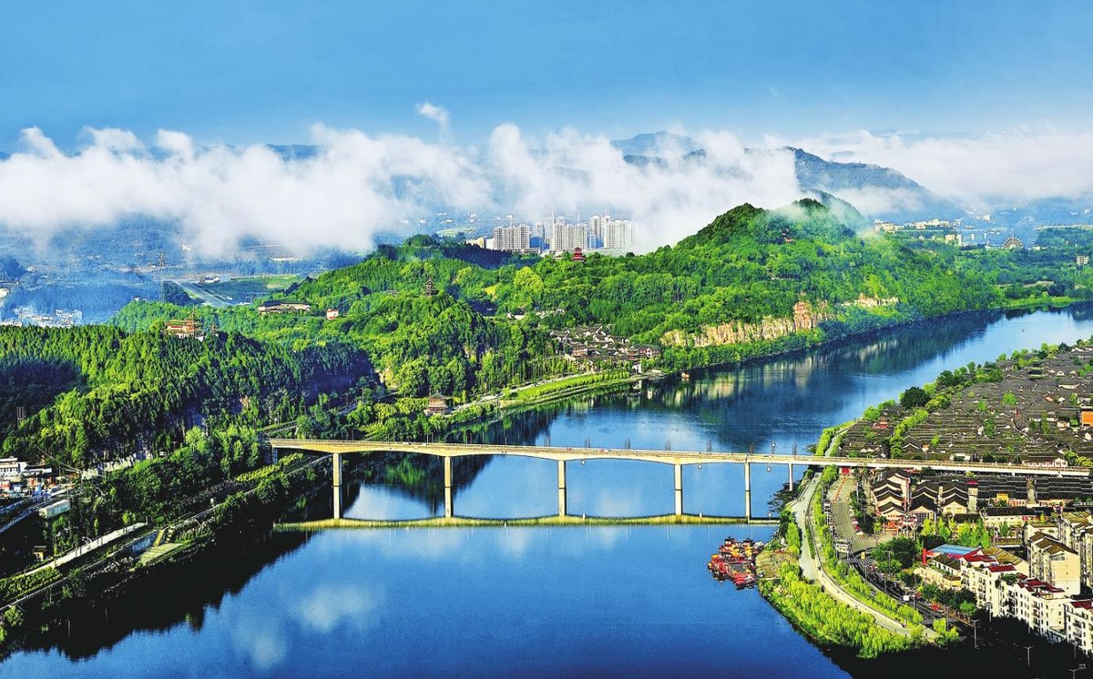 阆中古城山围四面、水绕三方,千里嘉陵江穿过千山万壑,奔腾至此,用一道完美的U形大湾将她轻拥入怀,昂扬挺立、层峦叠嶂的连绵青山,百转千回、柔情万里的嘉陵碧波,让山、水、城相依相融,描绘出一幅水墨丹青的“阆苑仙境”。