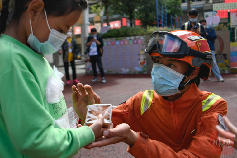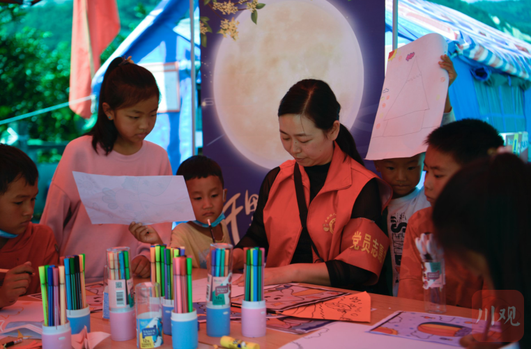 9月10日,中秋节当日,记者探访石棉县多个受灾群众安置点。石棉县草科乡中心小学临时安置点,学校百余名师生齐聚一堂,玩游戏、做手工,与来自凉山州森林消防支队西昌大队的消防员进行互动。