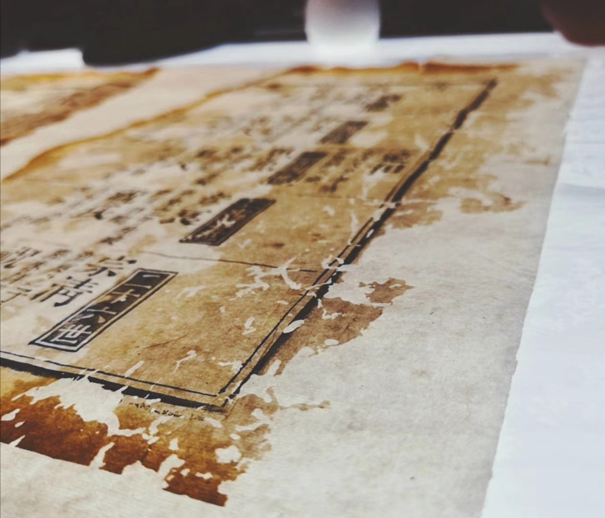 为了避免呼气吹飞这些小碎渣,修复师常需戴上口罩,屏气修复。粘在一起的书页,需要用水慢慢软化,再拿着起子,一页一页揭开。断裂掉的栏线、字,小心翼翼被拼接后,修复师们还需要将书中碎片一一挑出,放入书中反复比对、粘贴。