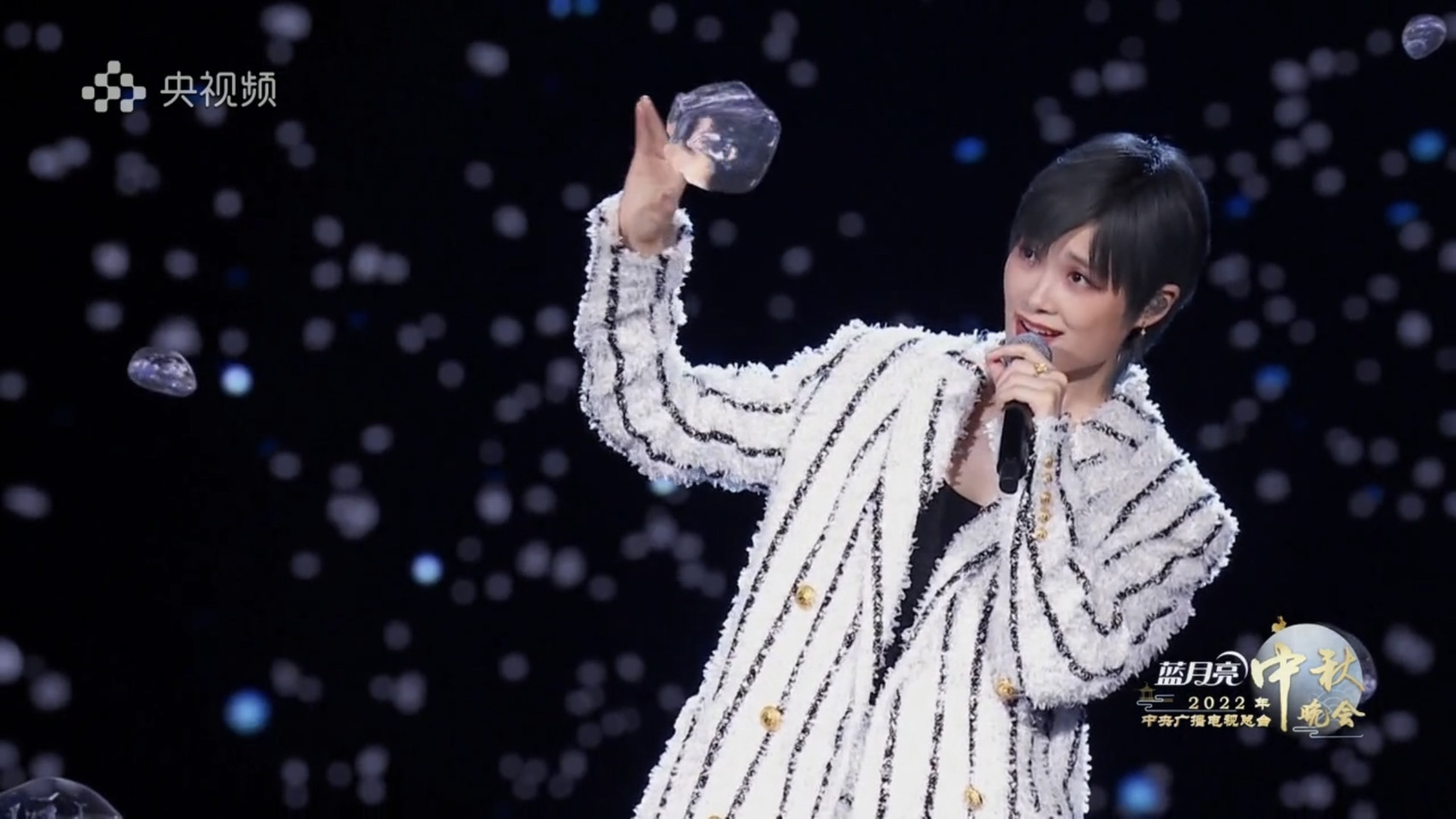 这也是李宇春首次在央视中秋晚会参与虚拟舞台录制。演唱过程中,她脚下的舞台缓缓升起,她逐渐悬浮在星光闪烁的“太空”中。更令人惊喜的是,通过技术手段,李宇春与神舟十四号航天员陈冬、刘洋、蔡旭哲实现“互动”,从刘洋手中“接过”一颗纸星星。“中秋是一个团圆的日子,但我们的航天员不能跟家人团聚,这个节目希望让秋晚现场跟宇宙中的他们连接起来,也把一份中秋的祝福和敬意带给他们,希望他们的工作、任务一切顺利,早日回来跟家人团圆。”