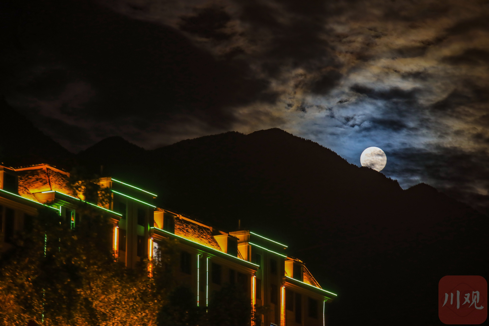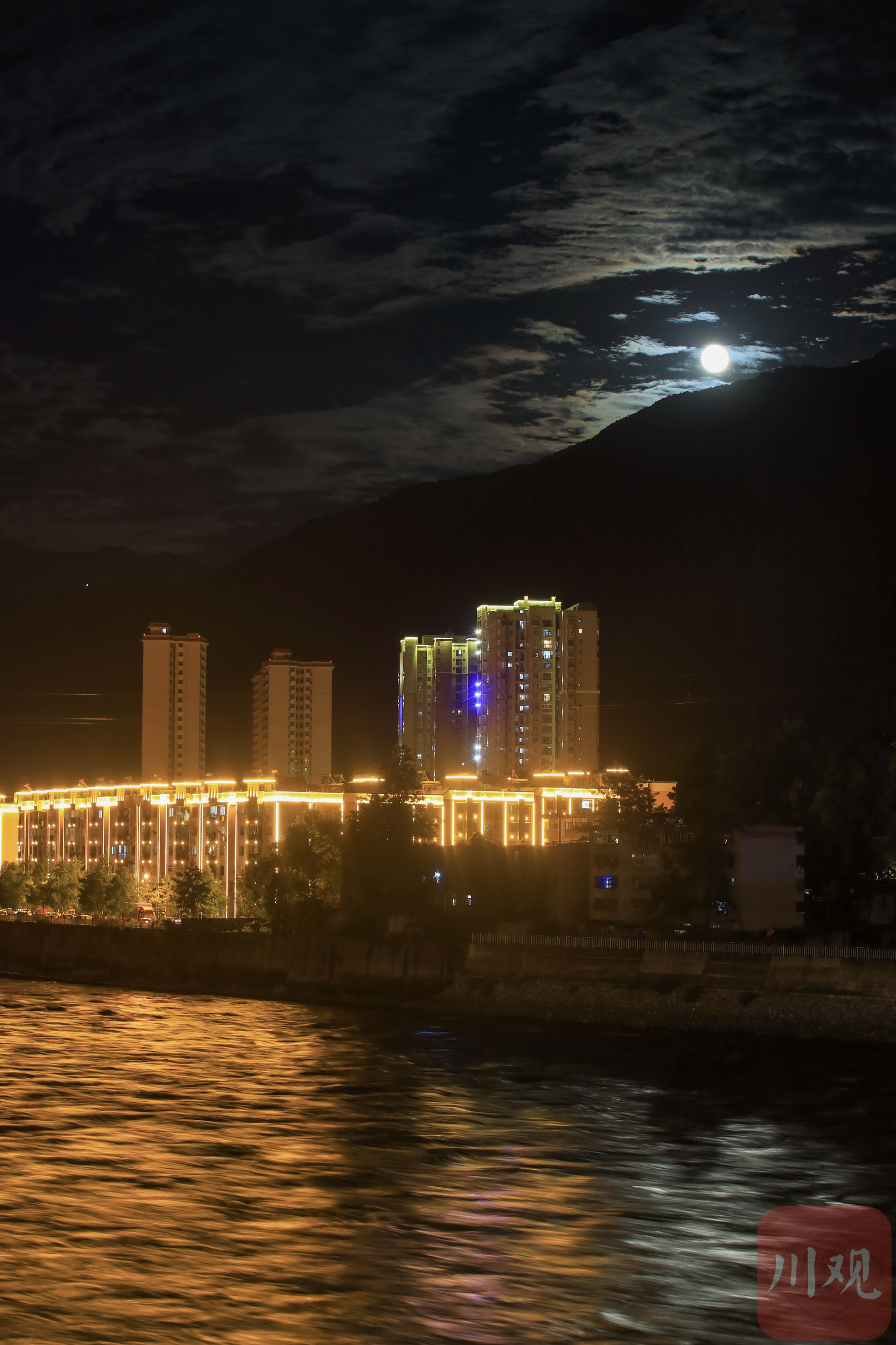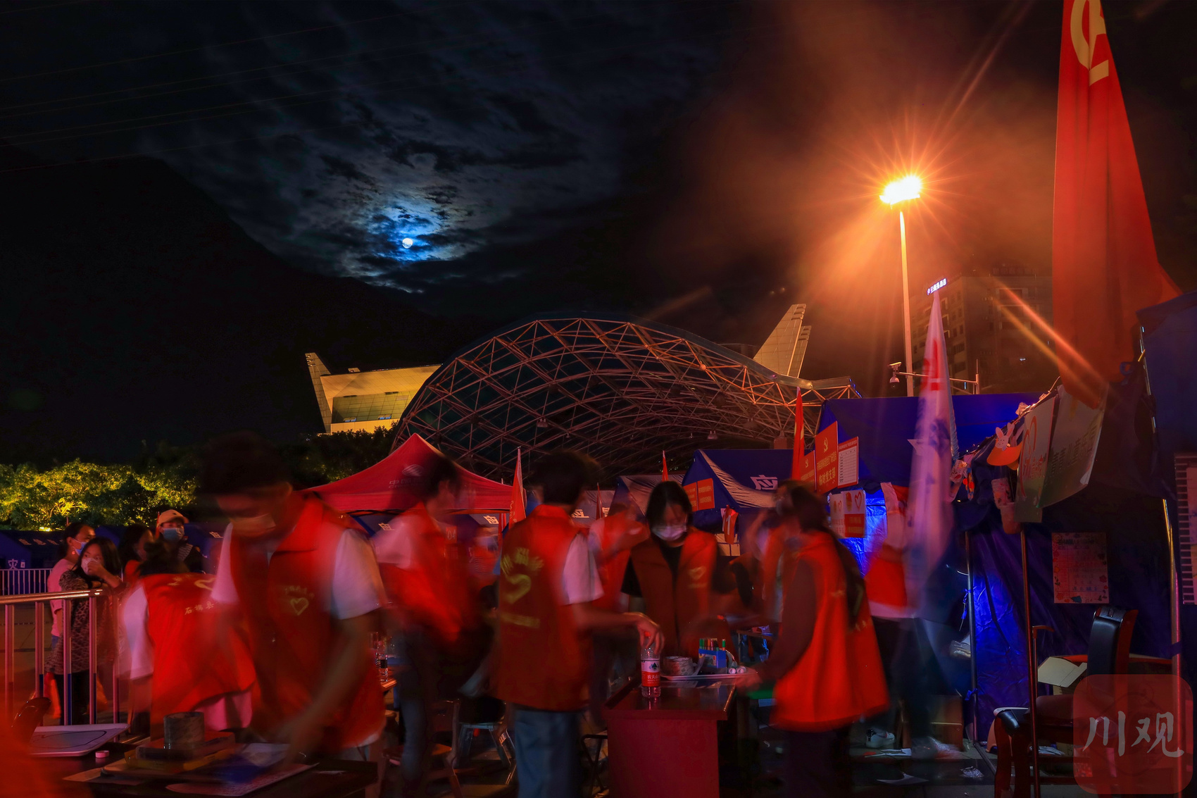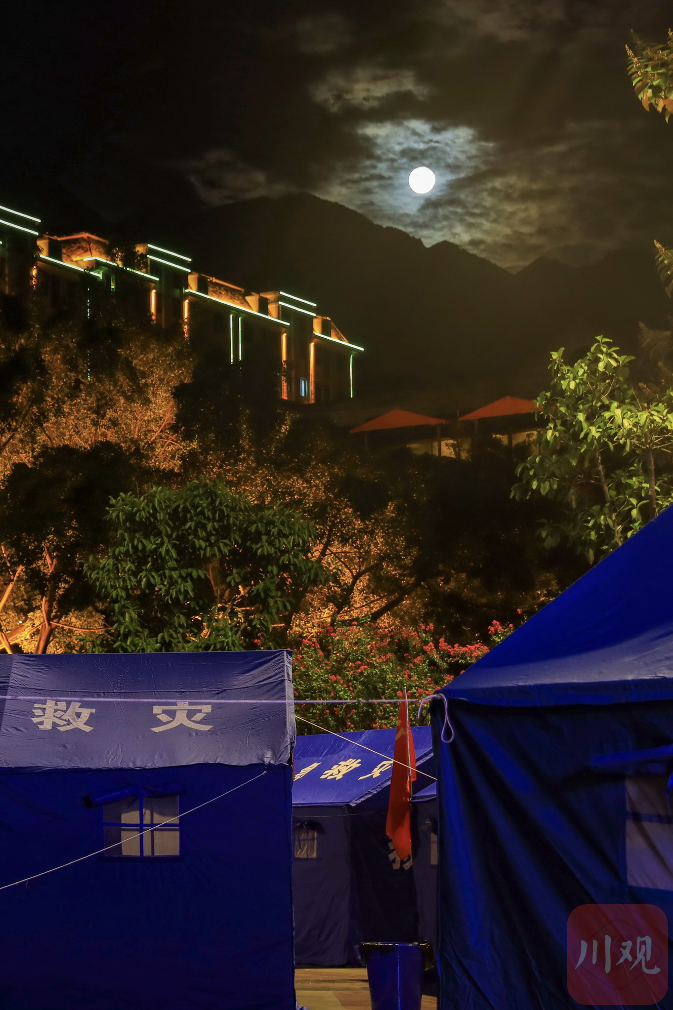 9月10日中秋夜,夜晚的石棉县世纪广场临时安置点,皓月当空。安置点里的群众大多已经睡去,现场的志愿者们仍然忙碌着。