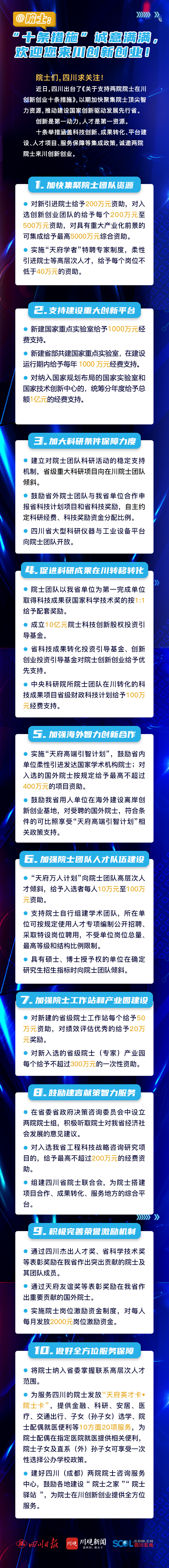 “十条措施”主要涵盖加快集聚院士团队资源、支持建设重大创新平台、加大科研条件保障力度、促进科研成果在川转移转化、加强海外智力创新合作、加强院士团队人才队伍建设、加强院士工作站和产业园建设、鼓励建言献策智力服务、积极完善荣誉激励机制、做好全方位服务保障等十方面内容,将多角度、多领域、多层次支持院士及其团队在四川创新创业。