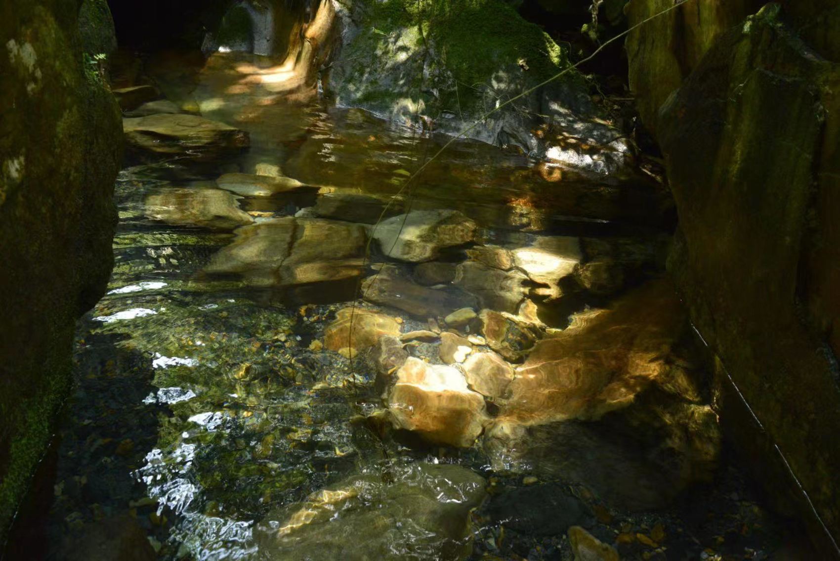 谷底是一条小溪,裸露着大大小小的石头。在那石头与石头之间,一汪一汪的泉水,大的像一面镜子,装满了青山绿水,小的像婴儿的眸子,不含一粒渣子。