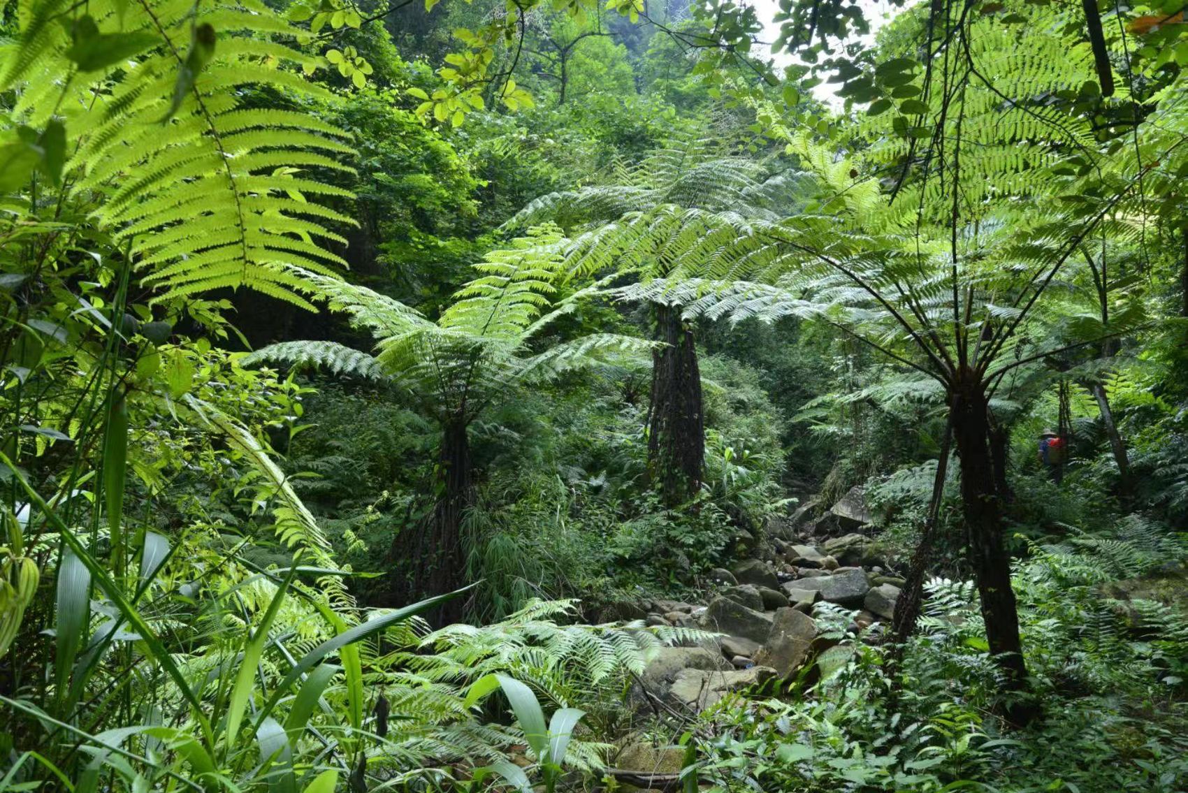 过石碑,下一陡坡,来到谷底,看到了大片的桫椤!