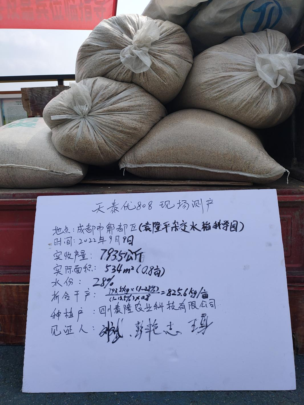 现场,收割机来回穿梭,工作人员奔忙不断。在机械化应急收割队的协助下,整个园区已完成抢收水稻350余亩,收获粮食近250吨。其中“天泰优808”经过田间测产,收打面积0.8亩、实收湿谷793.5公斤、水分含量28%,按13.5%含水量折合干谷亩产825.6公斤/亩。张向阳介绍,“天泰优808”是国家杂交水稻成都分中心选育并审定的首个稻渔专用稻品种。虽然已经过了最佳收获期,但“天泰优808”在田间仍然亭亭玉立、杆青籽黄,显示出了高耐肥抗倒性能。