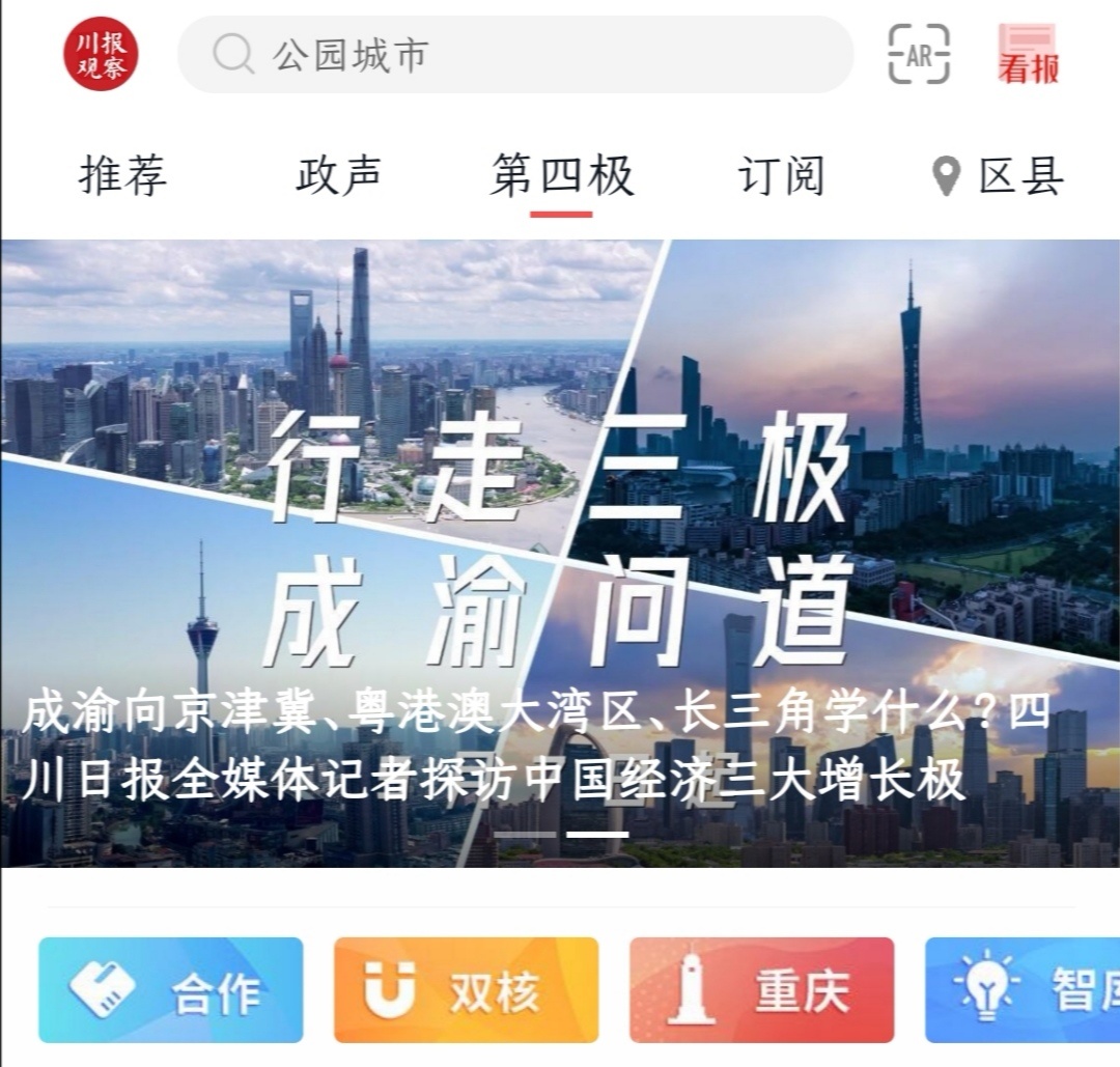 “第四极”频道,就是四川日报全媒体深刻把握媒体融合发展规律,创新联动协作机制的缩影。7月8日,由川报观察客户端与重庆日报客户端联手打造的全国首个省级党报客户端共建频道,刚一上线便引发全国关注,被业界、学界视为强强聚合助力国家战略、全媒传播讲好“双城”故事的担当务实之举。
