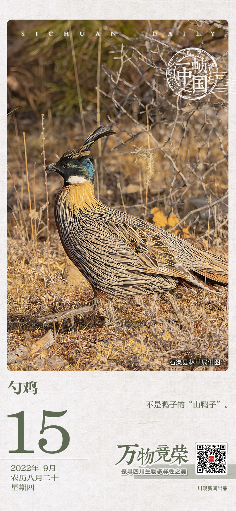 今年3月,荥经县大相岭自然保护区管理局工作人员在整理2021年红外相机数据时,在一组照片里发现了国家二级保护动物——勺鸡。在四川人口中,它有一个更接地气的名字:山鸭子。