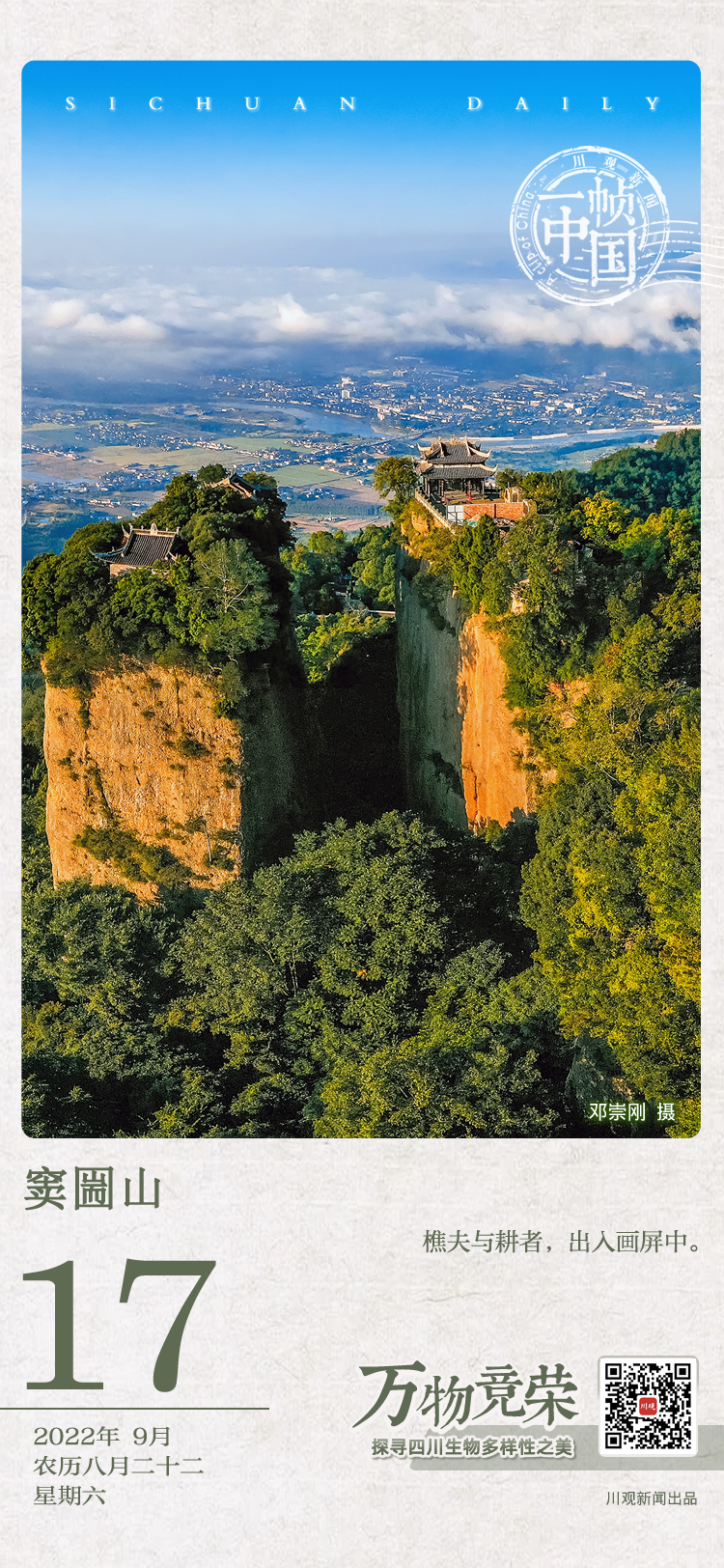 在四川的众多山峰中,有一座非常“低调”的山,它具有典型的丹霞地貌,也曾被诗仙李白盛赞。少年时李白曾在此地“打卡”并留下了千古名句——“樵夫与耕者,出入画屏中”。这就是窦圌(chuán)山,在四川方言中,它被叫做“窦团山”。