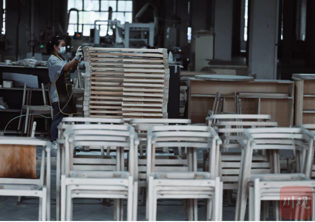 喂料,切割,砂磨。宽敞明亮的生产车间里,工作指令声、机器轰鸣声相互交织,戴口罩、穿灰色工装的工人们手快脚快、忙而不乱。一件件木制餐桌、客椅、储物柜等半成品,陆续走下生产线。