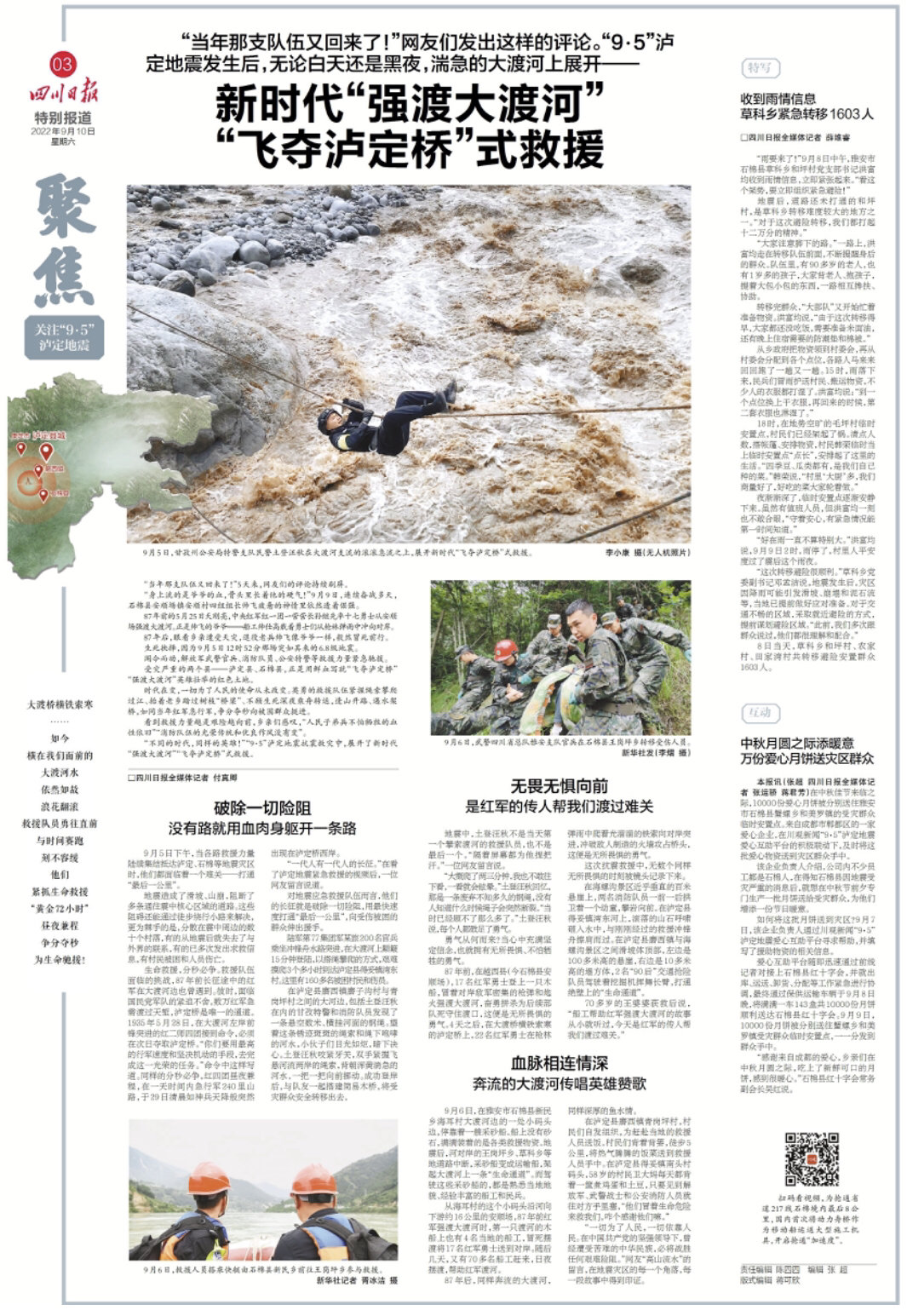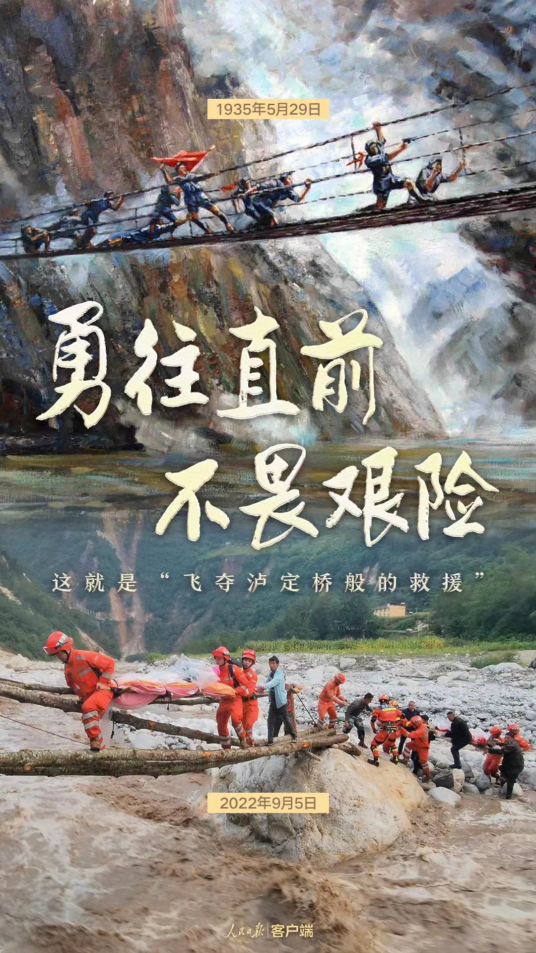 “飞夺泸定桥”成为此次抗震救灾报道中的一个共情点,引发广泛关注与热烈反响。人民日报大幅海报《勇往直前、不畏艰险!这就是“飞夺泸定桥般的救援”》,四川日报特别报道《新时代“强渡大渡河”“飞夺泸定桥”式救援》,四川广播电视台深度短评《现代版“飞夺泸定桥” 生命因你而闪耀》,四川新闻网报道《泸定6.8级地震丨四川甘孜特警“飞夺泸定桥”般的12小时生死救援》等报道都聚焦同一主题,放大传播声量,被广泛传播。