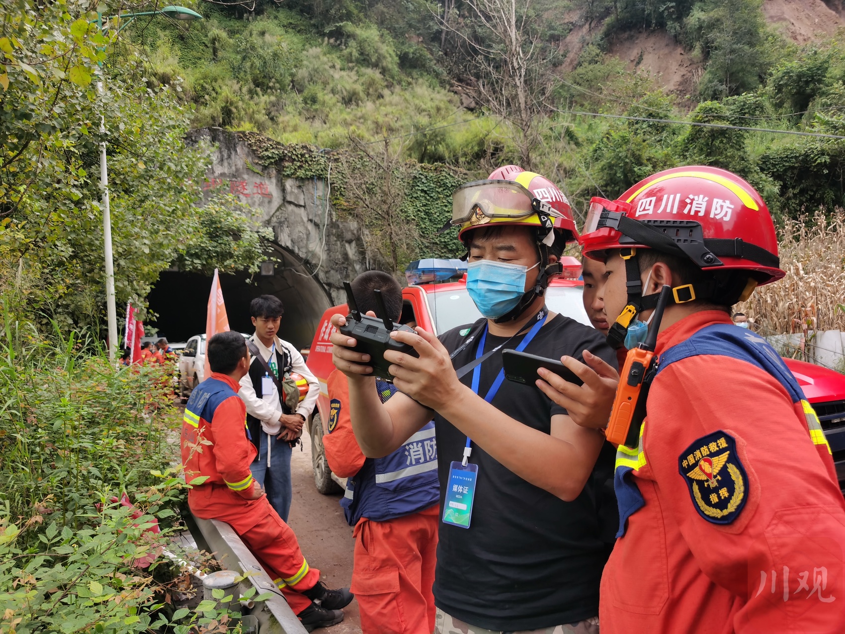 四川日报全媒体记者王云(右二)操作无人机拍摄灾区情况。张守帅 摄