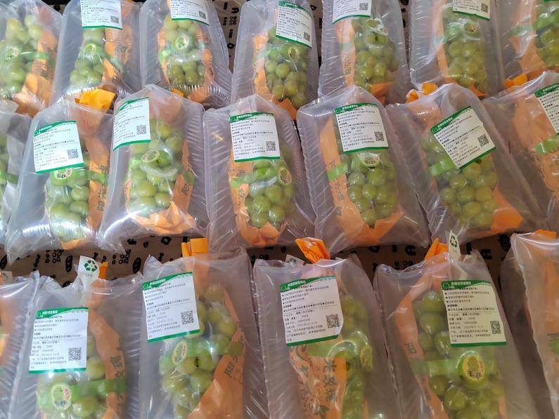 新津荣锦园家庭农场葡萄外包装上贴有“二维码+合格证”。
