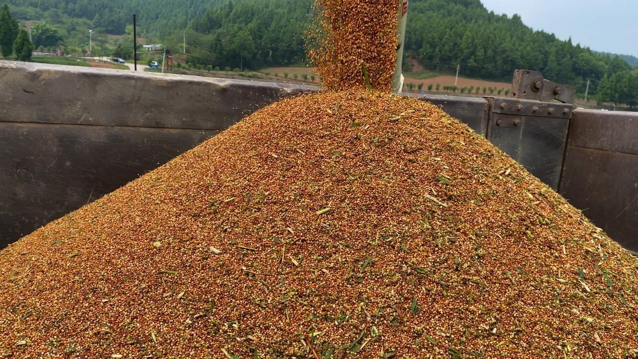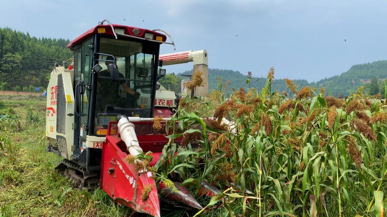 高粱垂红穗,又是丰收年。这几天,在遂宁市船山区河沙镇凤凰村、永兴镇新开村的优质粮油基地里,工人、机械齐上阵,多台大型高粱收割机在田间来回穿梭,收割、脱粒一气呵成,穗穗高粱“收入囊中”。
