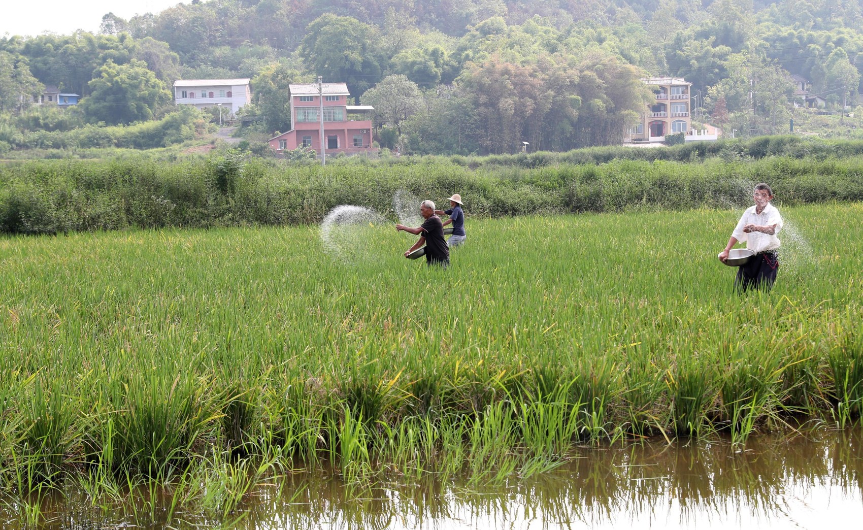 近日,在广安市广安区兴平镇互利稻虾养殖场的稻田里,200亩绿油油的再生稻长势旺盛,村民们在农技专家的指导下,为再生稻施肥。“现在主要是一个追肥阶段,每一亩施尿素肥最好,施尿素8到10斤,你们施肥的时候要撒均匀,肥料要撒开。”兴平镇农业技术推广站站长蒋裕兰在现场指导再生稻管护。