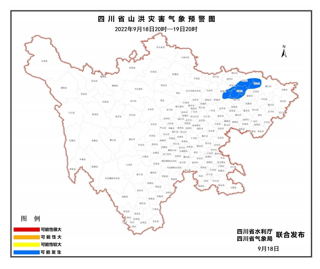 9月18日17时,四川省水利厅、四川省气象局联合发布山洪灾害蓝色预警,预警范围涉及川东北6县(市、区)。