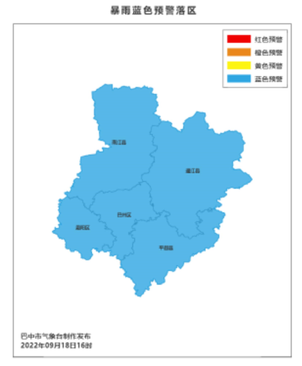 9月18日下午,四川广元市、巴中市气象台和南江县、巴州区、通江县、平昌县、苍溪县、旺苍县、剑阁县气象台先后发布了暴雨蓝色预警。