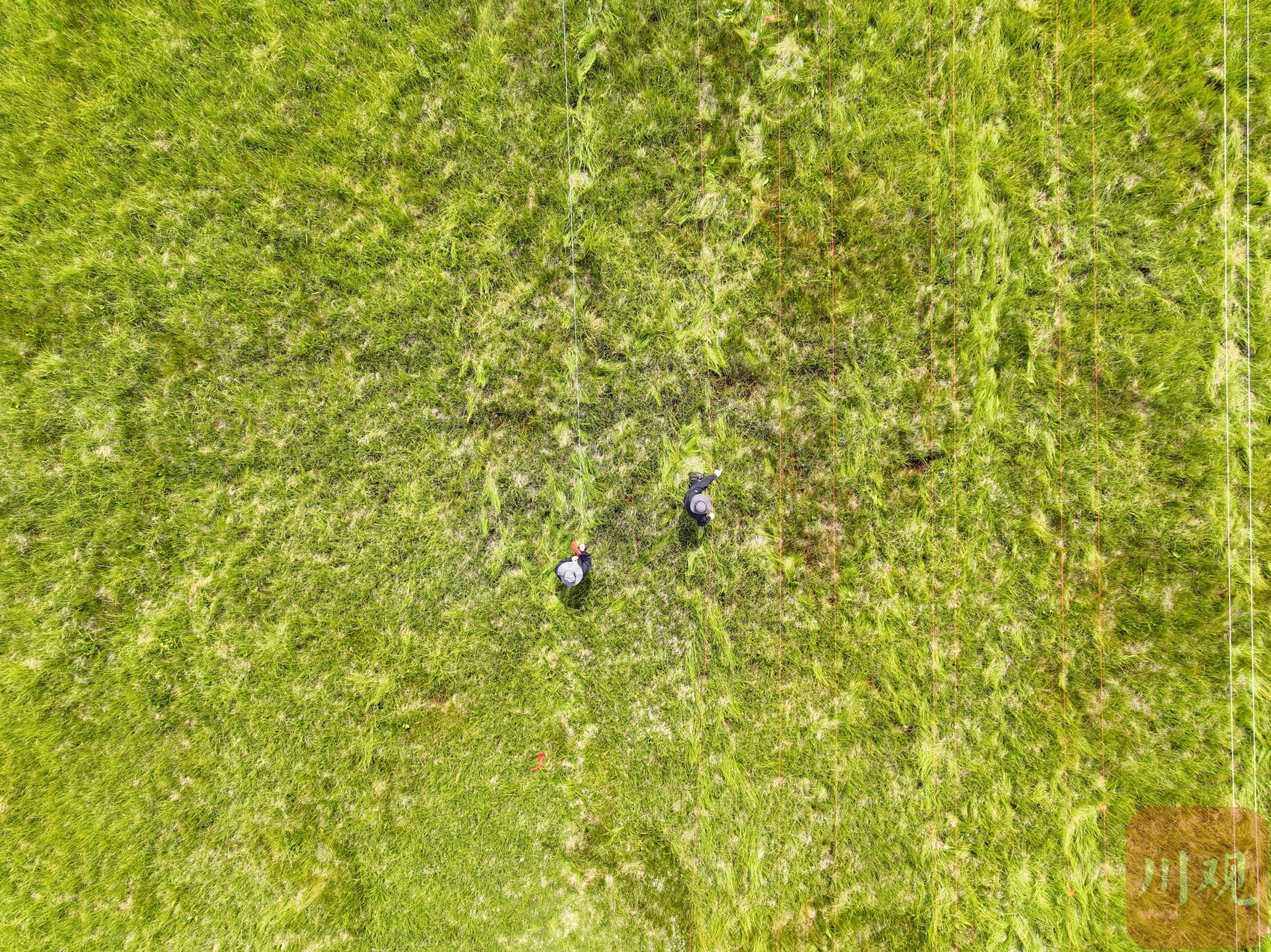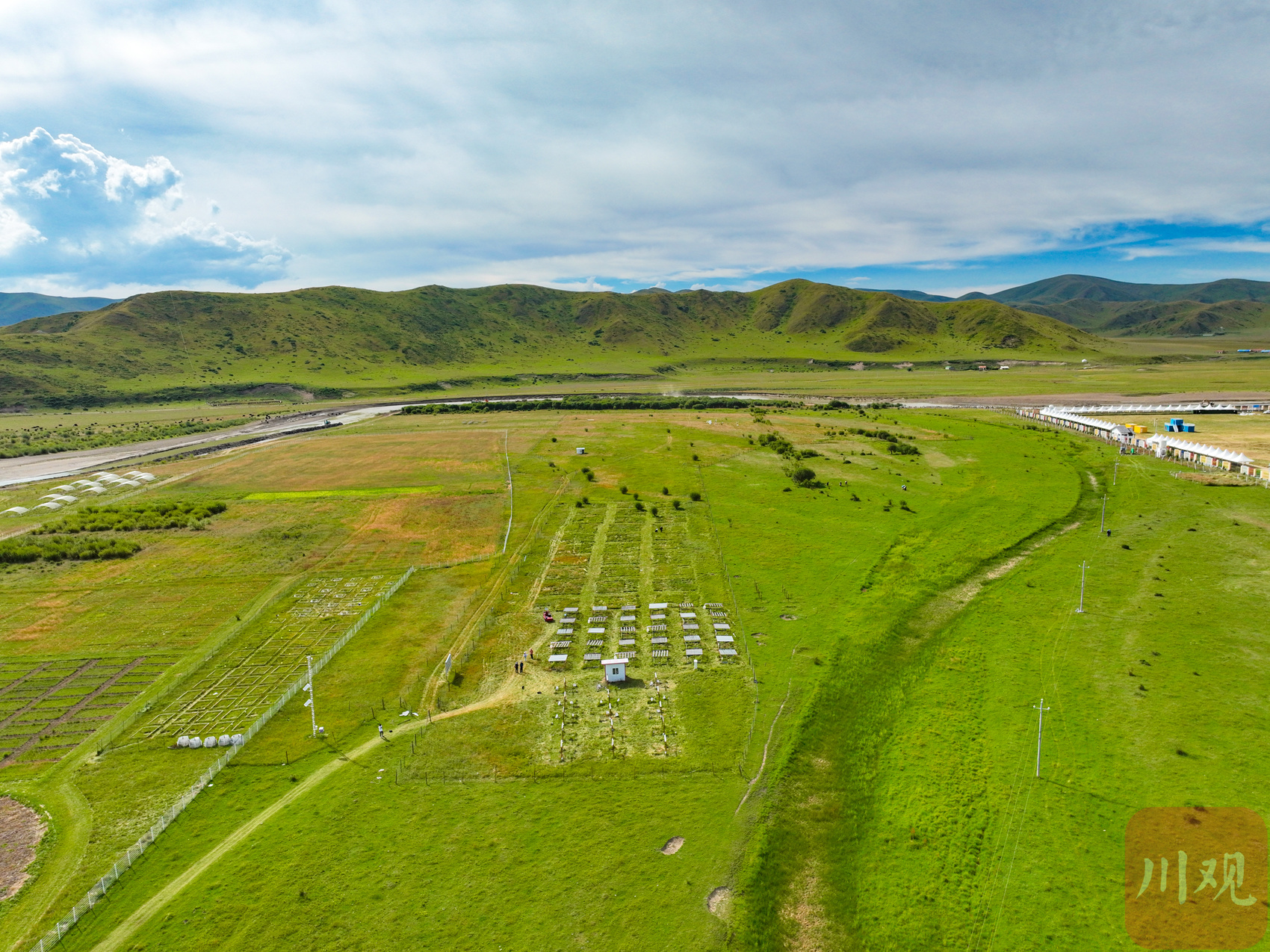 午后的清风拂过,牧草像海浪随风律动。从空中俯瞰若尔盖站的牧草种质资源圃,100多亩的资源圃被分成了若干区块,颜色深浅不一。因为每个区块内种植的牧草种类不同,其颜色、高矮、形状、产量各异。