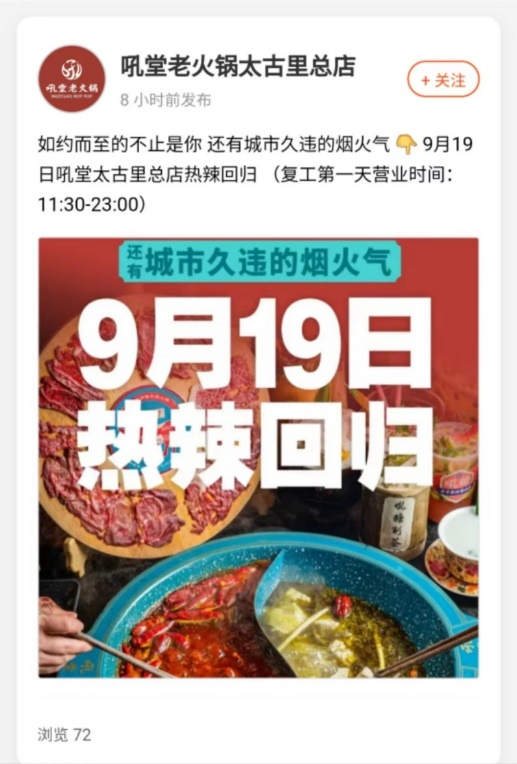 “得知可以恢复堂食后,我们第一时间在线上平台向食客们告知了营业状态。”吼堂老火锅老板李小孬坦言,“(疫情)对我们肯定有影响,但政府给了许多政策支持,线上平台也给了线上门店运营指导、引流推广等帮助。疫情期间,我们通过到店自提等方式日均营收能达到疫情前的60%左右。”