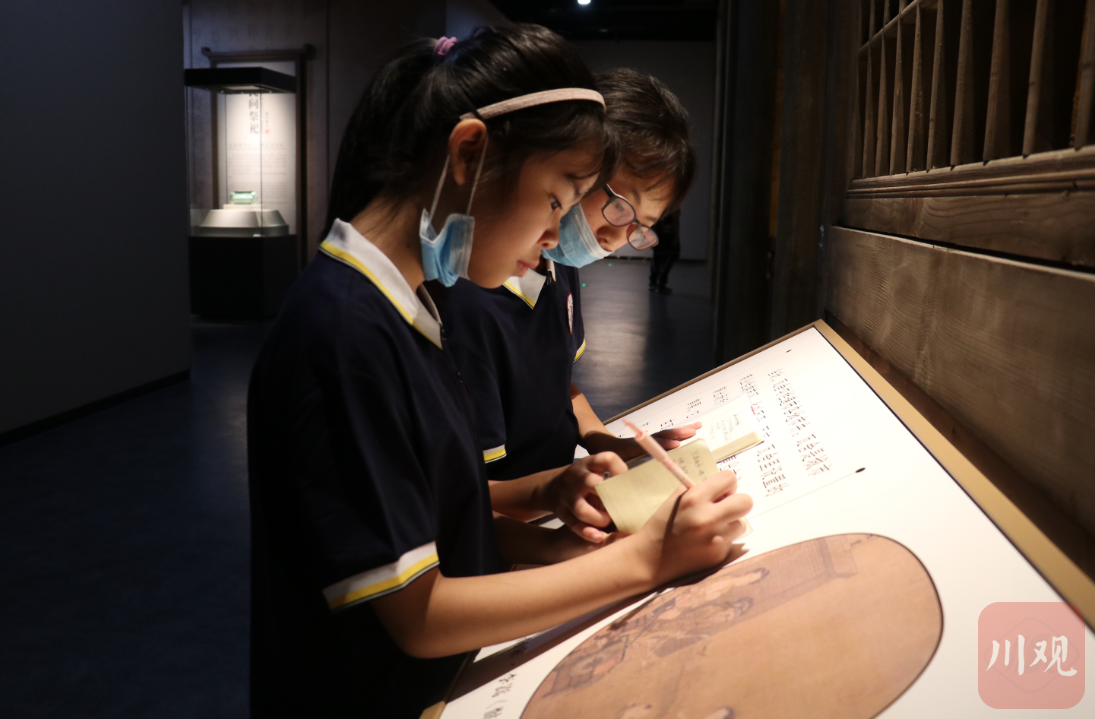 参观中,学生们一边听一边拿着笔记本记录。“我没想到在遂宁金鱼村发现的这些文物还有这么多的故事,我很震惊。”初一学生李天悦说。
