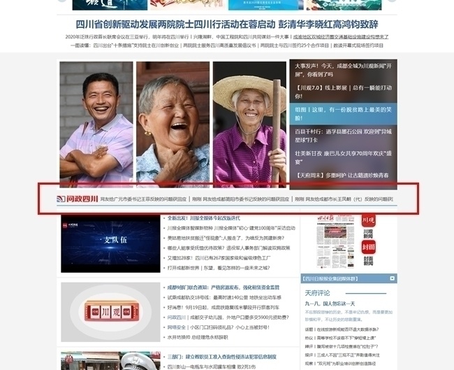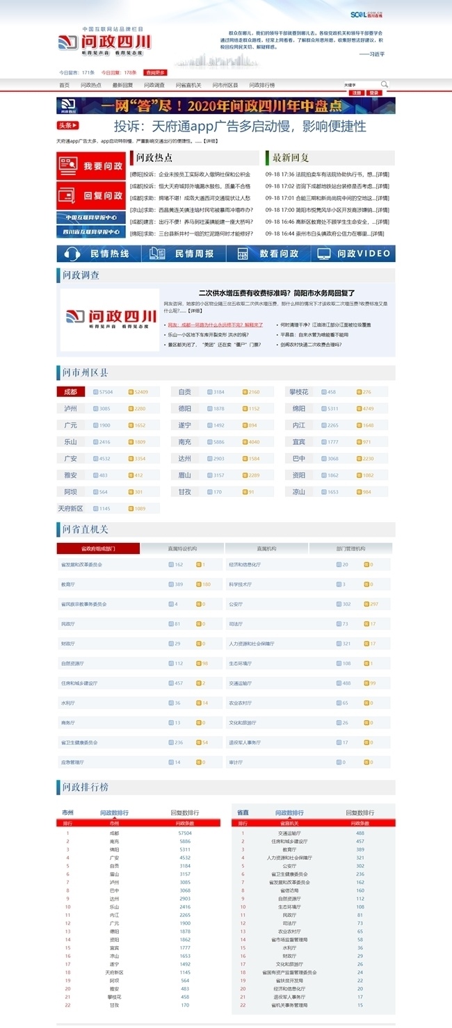 “问政四川”,一直秉持“理性问政、良性互动”的价值观,该互动平台已经被广大网友誉为“四川第一网络问政理政平台”,并形成了“在四川有困难,找问政四川”的良好口碑,曾获“中国互联网站品牌栏目(频道)”称号。截至目前,全省入驻(回复)“问政四川”的官方账号达3000余个,覆盖全省各级政府职能部门。2020年1-6月,“问政四川”平台共计发布网友问政留言19156件,与2019年同期相比上涨189.72%;收到相关部门回复17017条,与去年同期相比上涨210.93%,回复率近90%。其中,成都市各市级机关、区县网友留言回复率达到100%。四川在线借此次改版升级之机,再次对“问政四川”平台进行升级,增加视频上传、留言反馈等功能,提升用户体验。特别设置“问政调查”栏目,旨在进一步依托四川日报全媒体记者的采访力量,加大对问政留言线索的调查采访力度,增加网友反映问题在四川日报全媒体矩阵平台的曝光率,推动网友“操心事、烦心事、揪心事”得到及时解决,将“问政四川”打造成全省各级政府部门走好“网上群众路线”的重要互动平台。此外,四川在线的“天府评论”、“天府社区”等品牌栏目也在此轮改版升级中,围绕目标用户进行强化定位,优化体验,并以此走出一条垂直化、特色化发展之路。