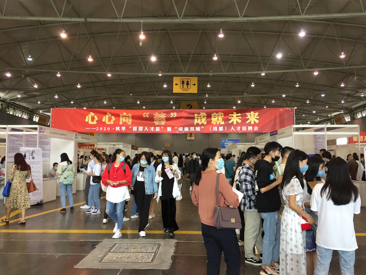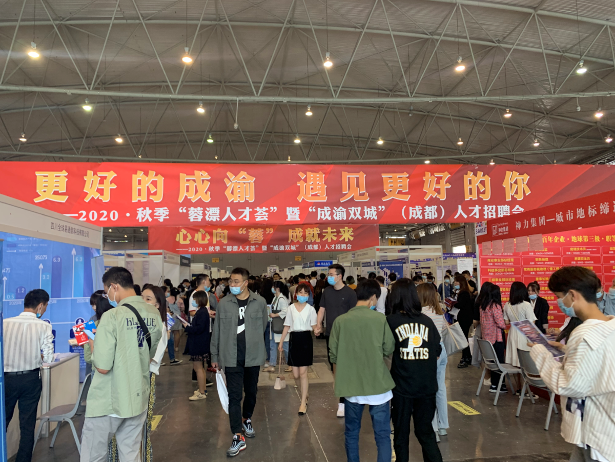 9月19日,2020·秋季“蓉漂人才荟 ”暨“成渝双城”(成都)人才招聘会在成都世纪城新会展中心举行,用人单位超600家,岗位需求逾2万人,平均月薪7877元,进场求职者达1.8万人次。