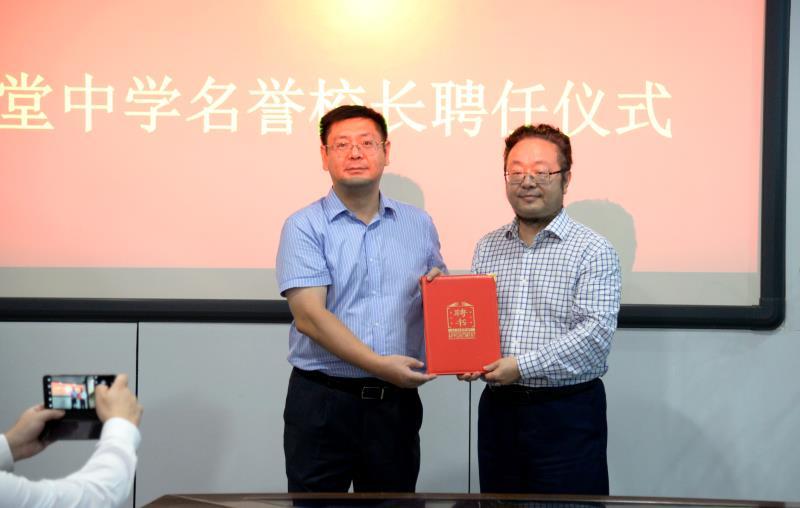金堂县委副书记、县长古建桥为贺克斌院士颁发金堂中学“名誉校长”聘书