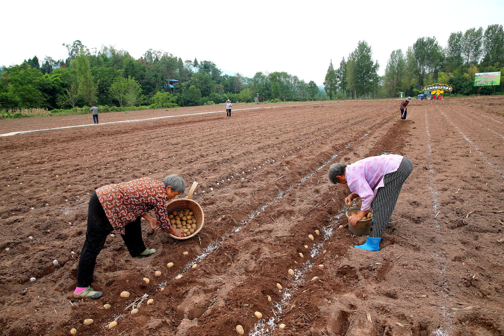 一大早,新芽村村民向太连推着秋洋芋种来到地里。他和老伴打配合,一人打窝,一人下种。“看嘛,车上都是刚领回来的种子,我们先种了两行洋芋,留了一行后面栽油菜。”向太连介绍道。