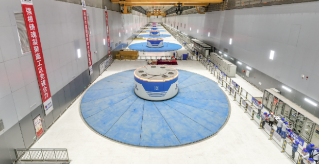 白鹤滩水电站位于四川省宁南县和云南省巧家县交界的金沙江下游干流河段上,是当今世界在建规模最大、技术难度最高的水电工程。白鹤滩水电站共安装16台单机容量100万千瓦水轮发电机组,其中1号至8号机组布置在左岸厂房,9号至16号机组布置在右岸厂房。