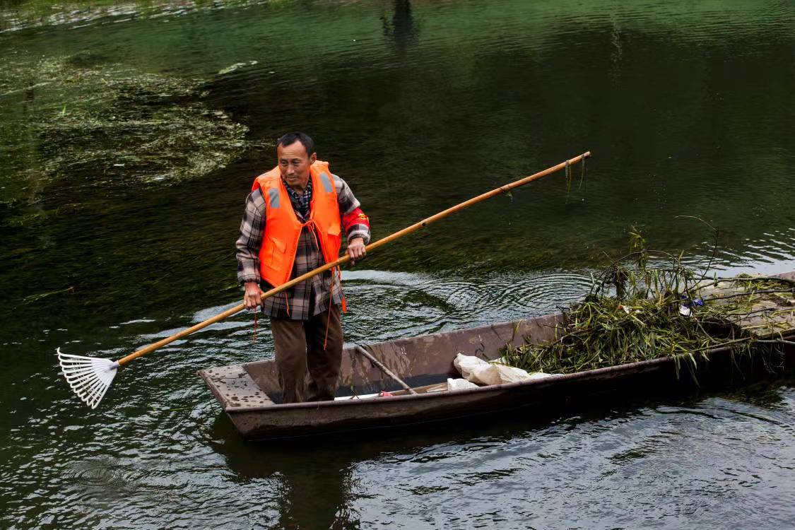 9月24日,三台县郪江镇郪江边,河道清除队负责人许禄金踏上小竹筏,沿着河道缓缓前行。看到有漂浮物和悬挂在河道旁树枝上的有色垃圾,他就顺手打捞起来,清澈的水面上倒映着他认真工作的身影。