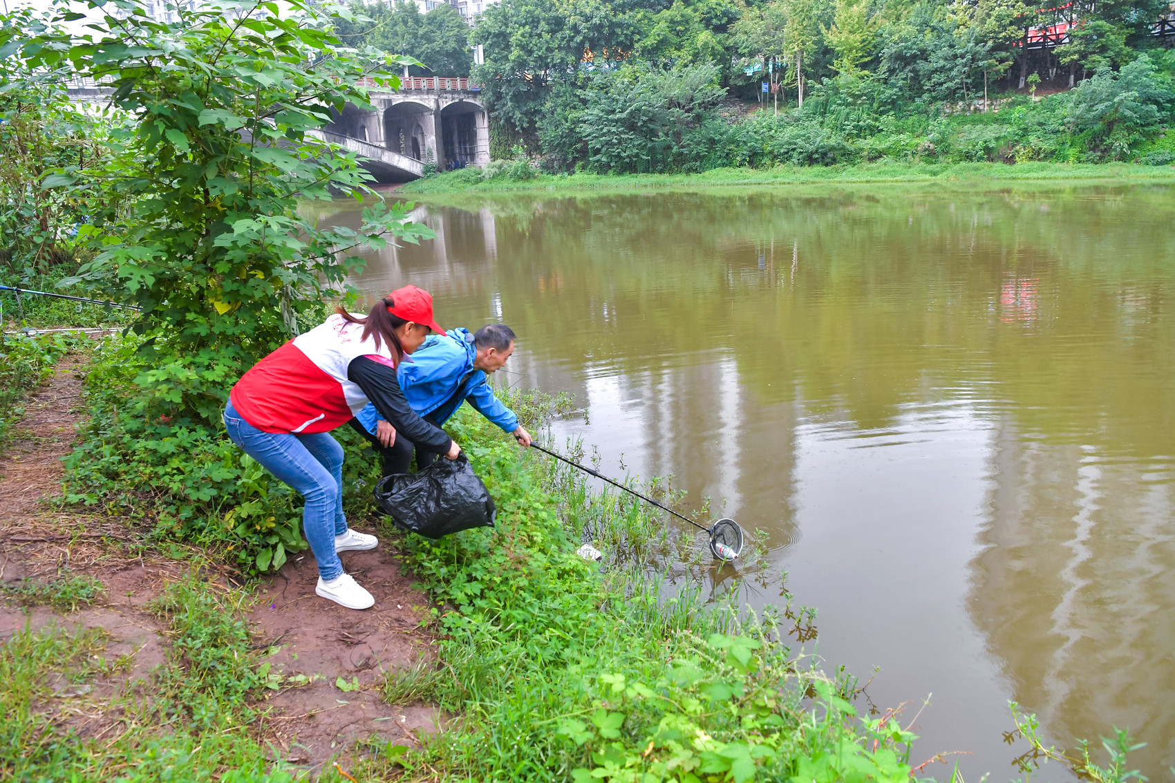 广安区万盛街道玉兔社区党委书记、河长李金成与社区事务助理雷文琼在西溪河边打捞水面垃圾。