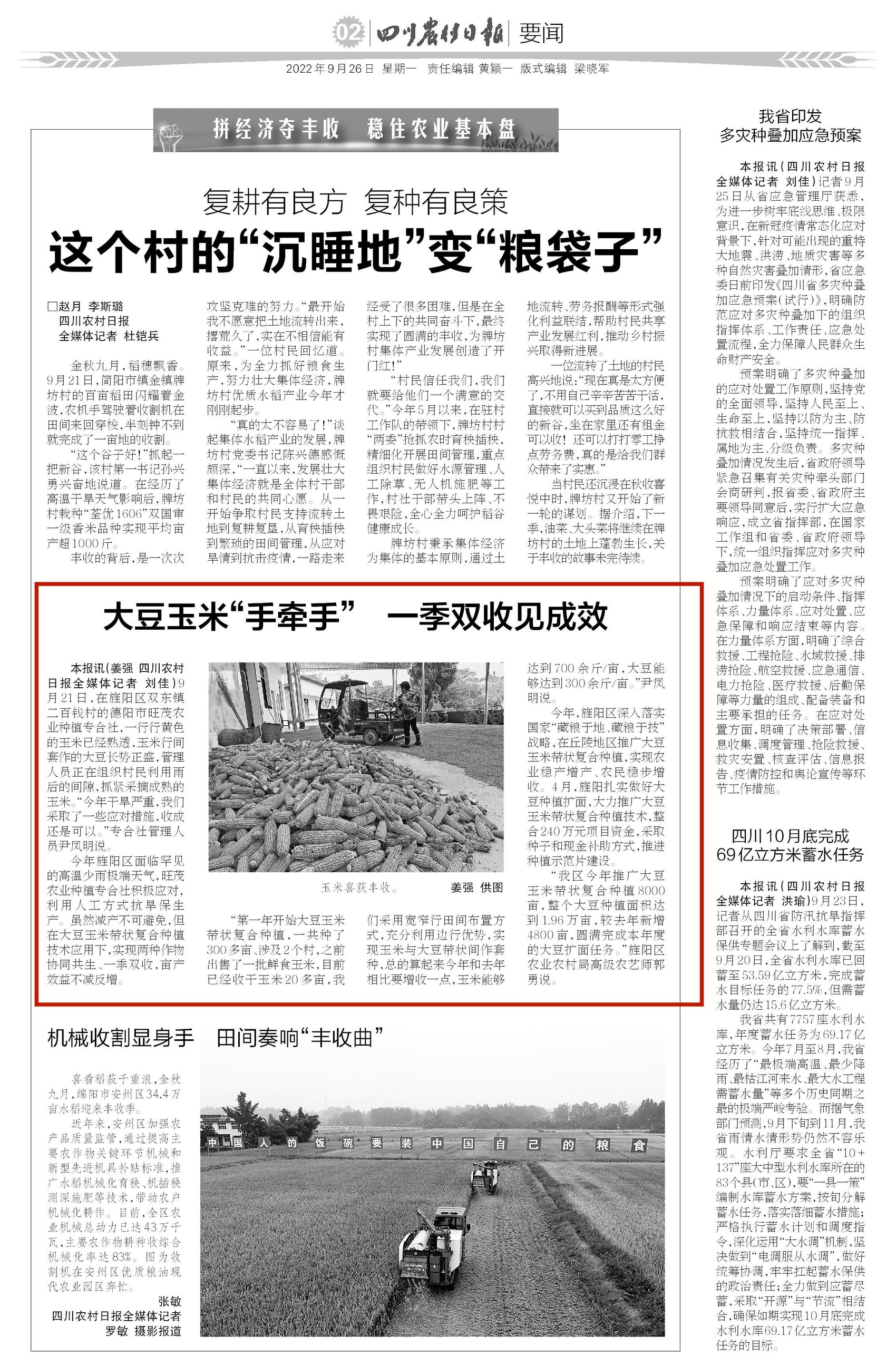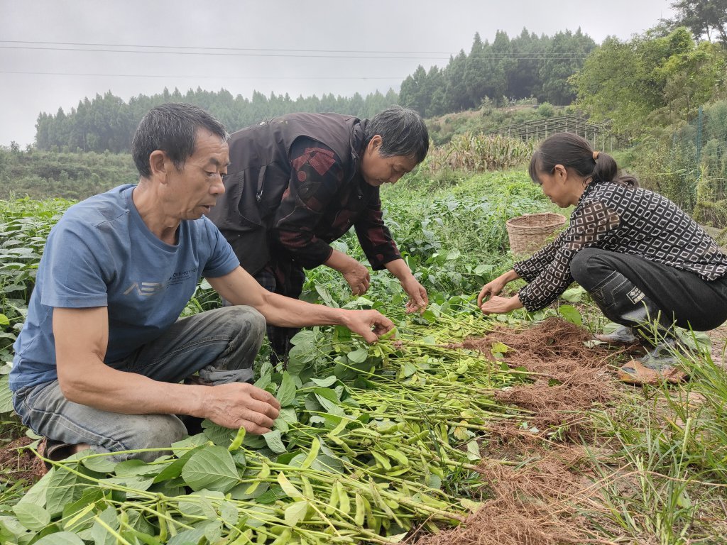 9月21日,在旌阳区双东镇二百钱村的德阳市旺茂农业种植专合社,一行行黄色的玉米已经熟透,玉米行间套作的大豆长势正盛,管理人员正在组织村民利用雨后的间隙,抓紧采摘成熟的玉米。“今年干旱严重,我们采取了一些应对措施,收成还是可以。”专合社管理人员尹凤明说。