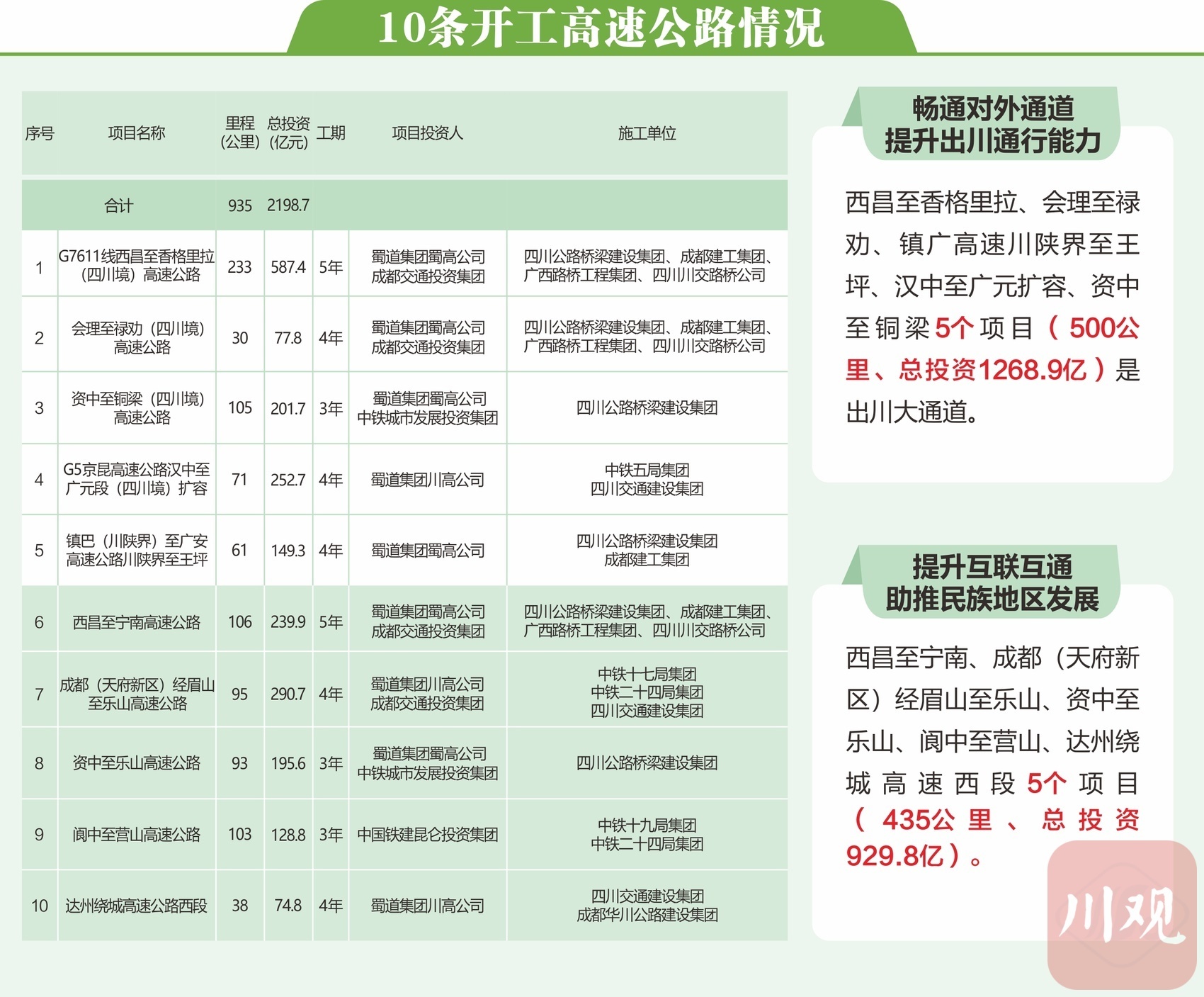 9月26日,我省10个高速公路项目集中开工,总里程935公里,总投资2198.7亿元,项目数量、投资额度创四川交通历次开工之最。