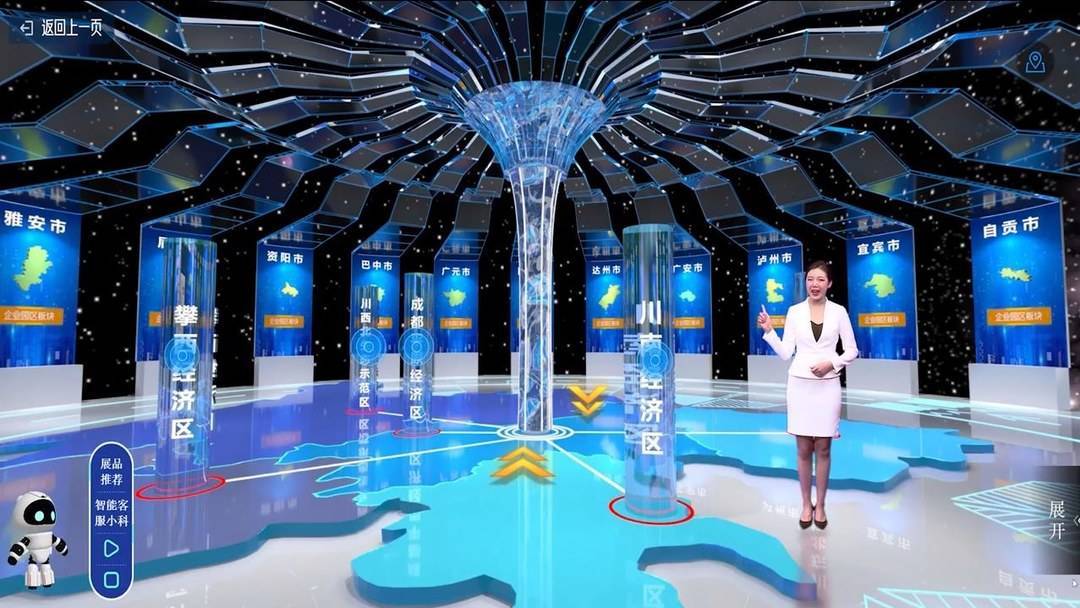 逛完整个展馆,绵阳科技城的高速发展一定会令你震撼不已!整个观展过程,“金色箭头”、“蓝点光标”将辅助你云上观展,或通过点击导航快捷进入目的区域,与此同时,机器人小科也会时刻跟随你的脚步做你的导览“小助手”。