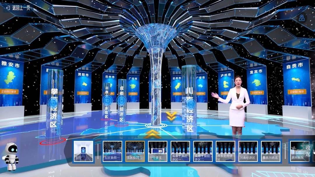 如果想进一步了解四川21个市州的发展情况、重点平台和企业,以及它们在2020年的“成绩单”。可以点击地上的金色箭头进入一干多支五区协同展区,便可以在展区中央看到整个四川地图,点击中间综述墙的蓝色光标或者选择科技树干连接的21个市州。