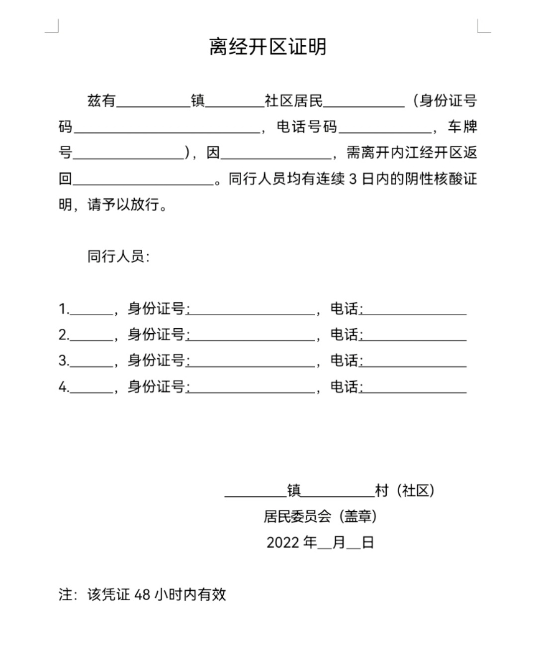 离区人员向村(社区)填报离经开区通行证明(见附件)一式两份,提交相关资料,村(社区)核实并在通行证明上签字盖章。