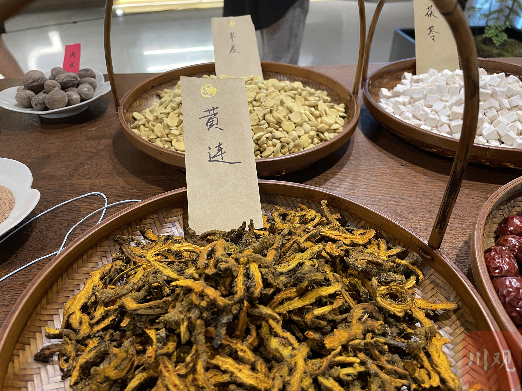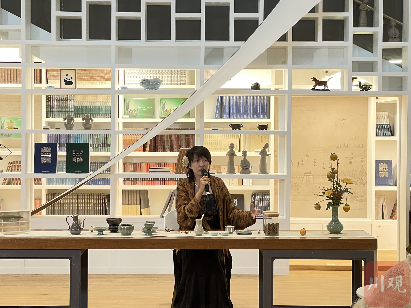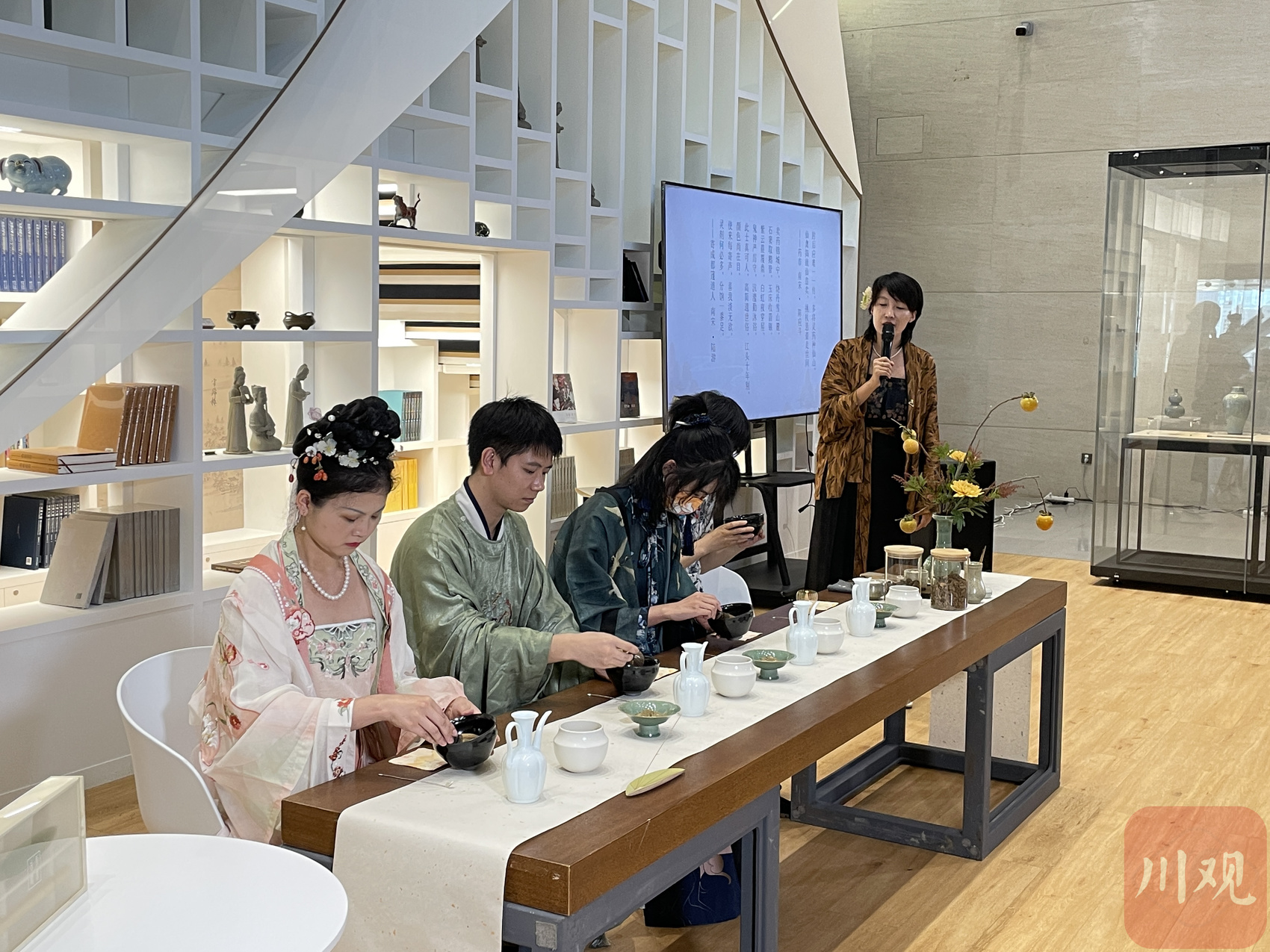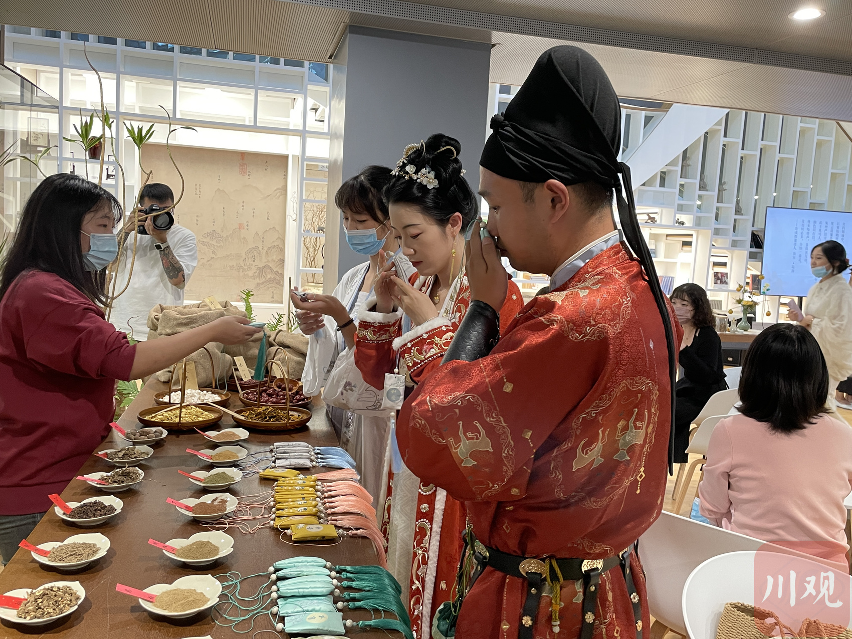 宋时成都的重九药市,除了药材之外,更是汇集了八方物品,供人购买。在雅集现场,主办方也模拟古时的药摊,在几案上摆出薄荷、柴胡、黄连、茯苓等药材,以及绣有“吉祥”字样的各色香囊。结合成都博物馆正在举行的“空明流光——宋瓷·五大名窑特展”,嘉宾现场表演宋人点茶,并邀请市民上手体验作为宋人四大雅事之一的“茶事”,感受中华传统文化魅力。
