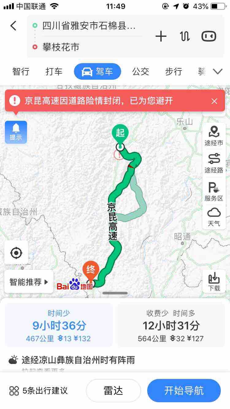 雅西高速、国道108线同时中断后,成都到西昌如何绕行备受关注。9月21日午时,记者从省交通运输厅获悉,经协调,高德、腾迅和百度的线路方案已调整为推荐绕行线路,成都到西昌沿线往返的驾乘人员,直接导航即可走上正确的路线。