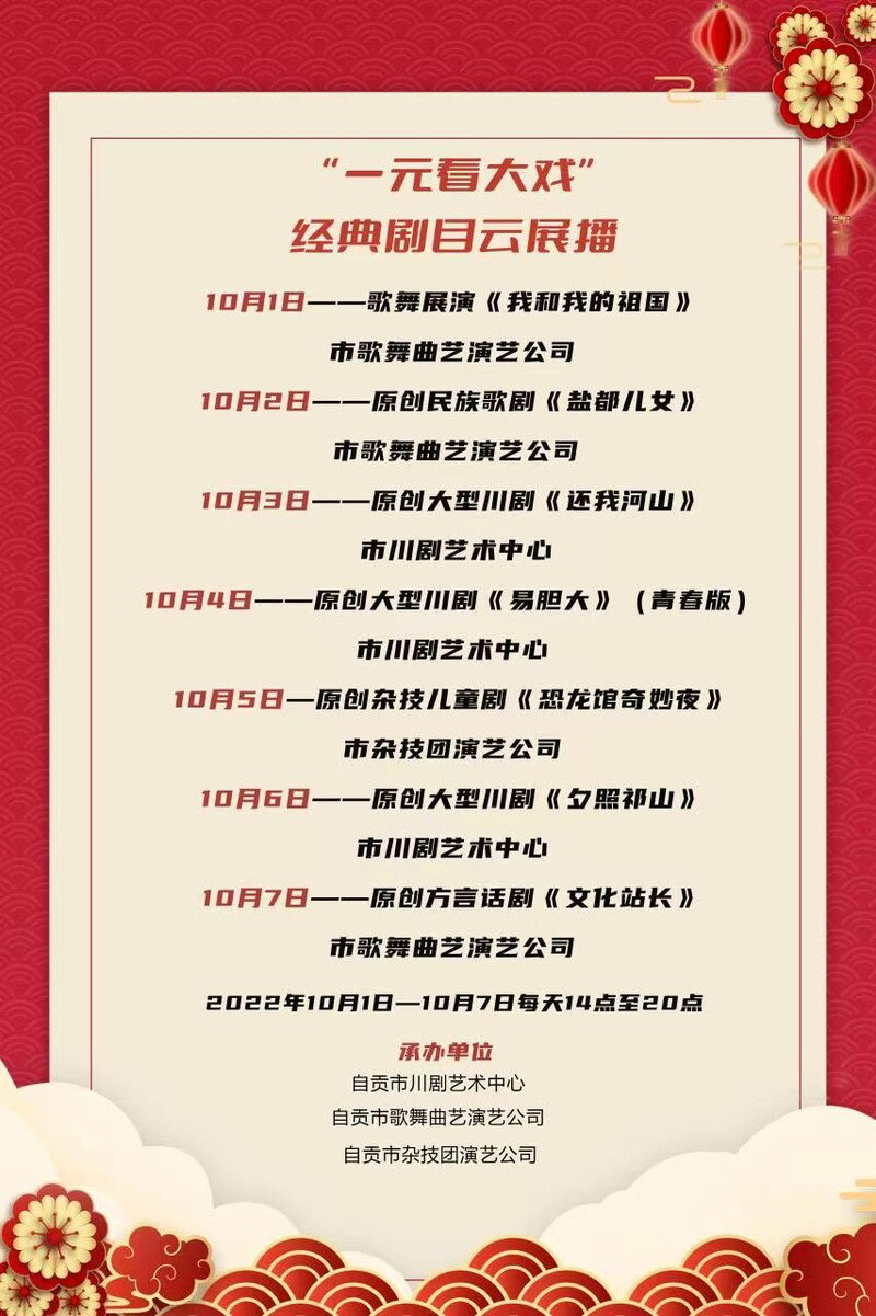 值得一提的是,国庆期间,自贡推出的线上活动也同样多彩。10月1日至7日的每日14时至20时,推出“国庆经典剧目云展播”,邀请网友以一元的惠民票价观看。观众可以搜索“盐艺汇”服务号或视频号等平台观看。此外,中国彩灯博物馆推出“非遗云体验”,开展科普答题和非遗讲座。