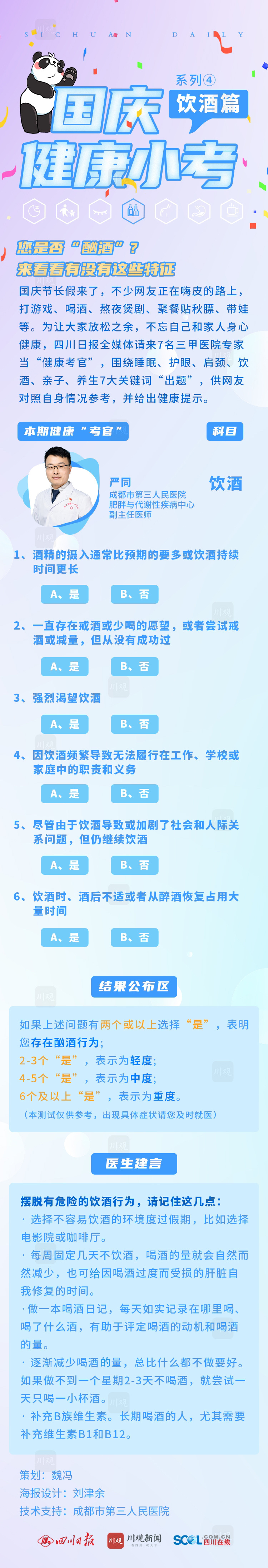 国庆长假,不少网友正在“嗨皮”的路上,打游戏、喝酒、熬夜“煲剧”、聚餐贴秋膘……放松之余,别忘了自己和家人的身心健康哦。川观新闻请来7位三甲医院专家当“健康考官”,围绕睡眠、护眼、肩颈、饮酒、亲子、养生7大关键词“出题”,邀请您来做,随后,医生会贴心为您作出针对性提示。