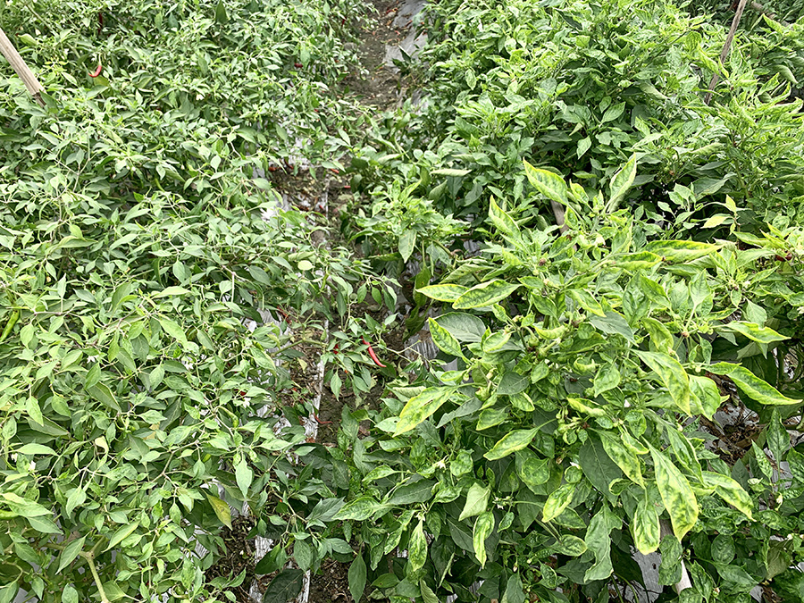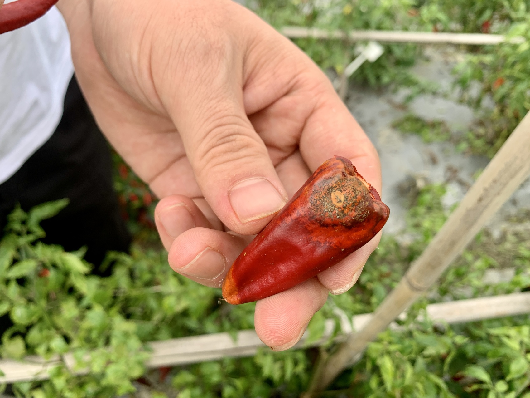 “你看,这就是被烟青虫危害过的辣椒,果实和叶芽都蛀伤了。”席亚东摘下一个明显软烂的辣椒果实向记者介绍,除了虫害,川渝地区辣椒还容易遭受病毒病、炭疽病、疫病侵染,从而引发减产甚至绝收。