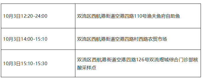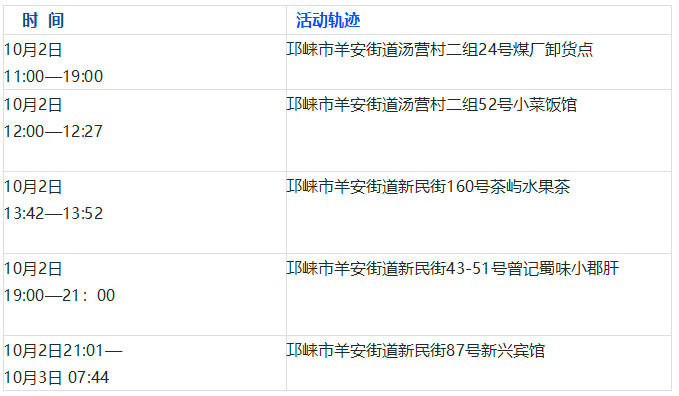 因一省外来蓉人员核酸检测阳性,现将其在我区活动轨迹整理如下,请市民朋友们对照自查,与以下时间和空间有重叠的人员立即制动,主动向社区和单位(或居住的酒店)报备,严格居家隔离,三天内接受三次核酸检测(间隔24小时)。若接到疾控部门电话被判为密切接触者,请积极配合落实相关防疫措施。